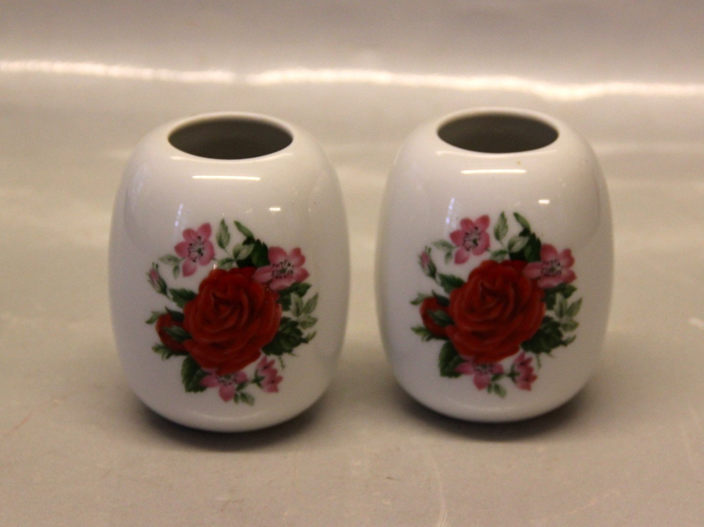 : Bing & Grøndahl Par vaser med rød rose 8 cm I fin og hel stand.