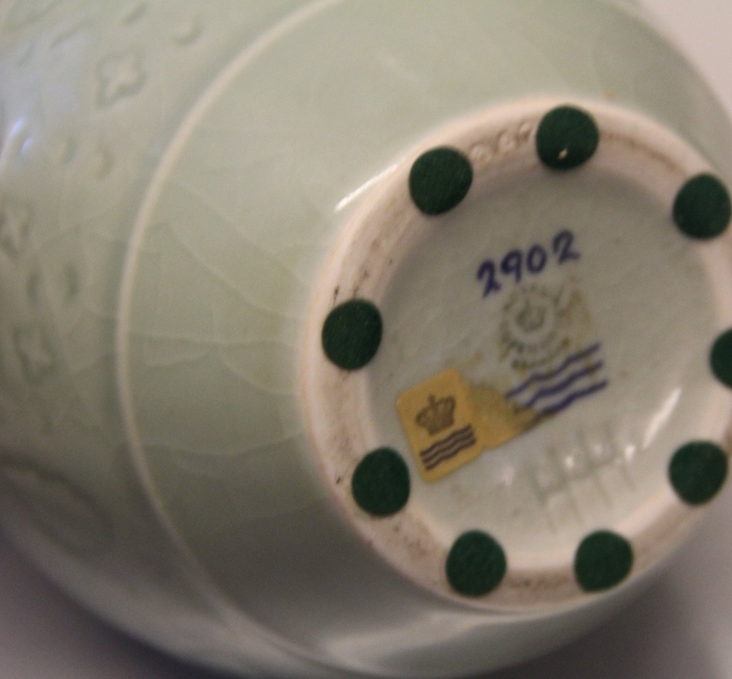 Kongelig Dansk Stentøj 2902 Kgl. Grøn Krakkeleret Celadon med egeblade i relief 18 cm signeret HHH