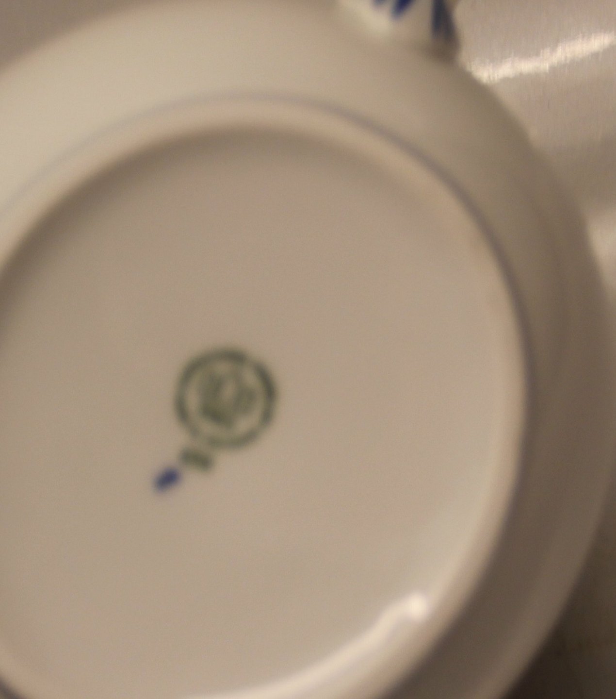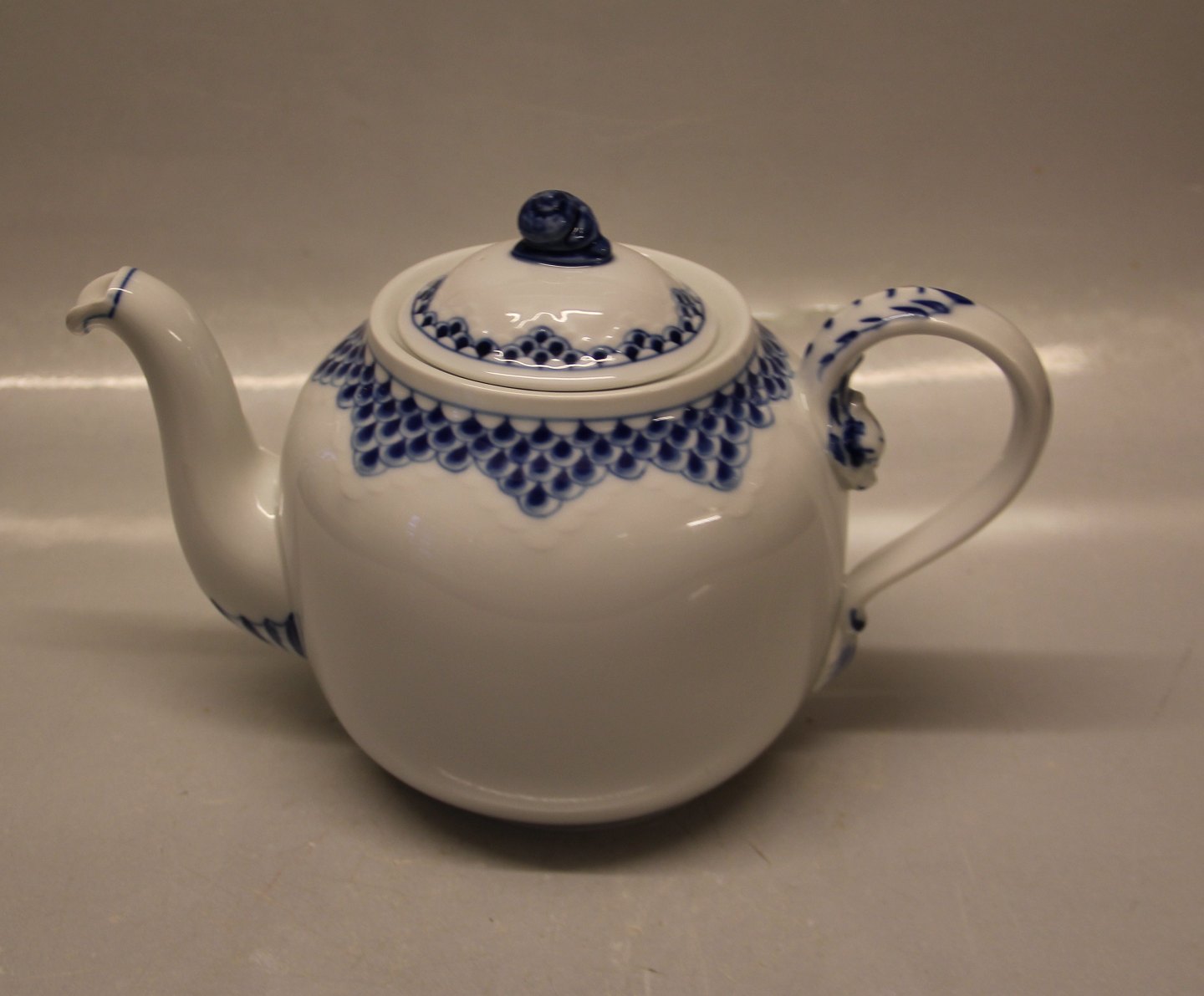 Beskrivelse: 092 c Tekande, (stor) 1 l. (656) Bing & Grøndahl Kronberg Hvidt porcelæn, blå halvblonde med gennembrudt bort, form 356 I fin og hel stand Bing & Groendahl minder om Royal Copenhagen Prinsesse