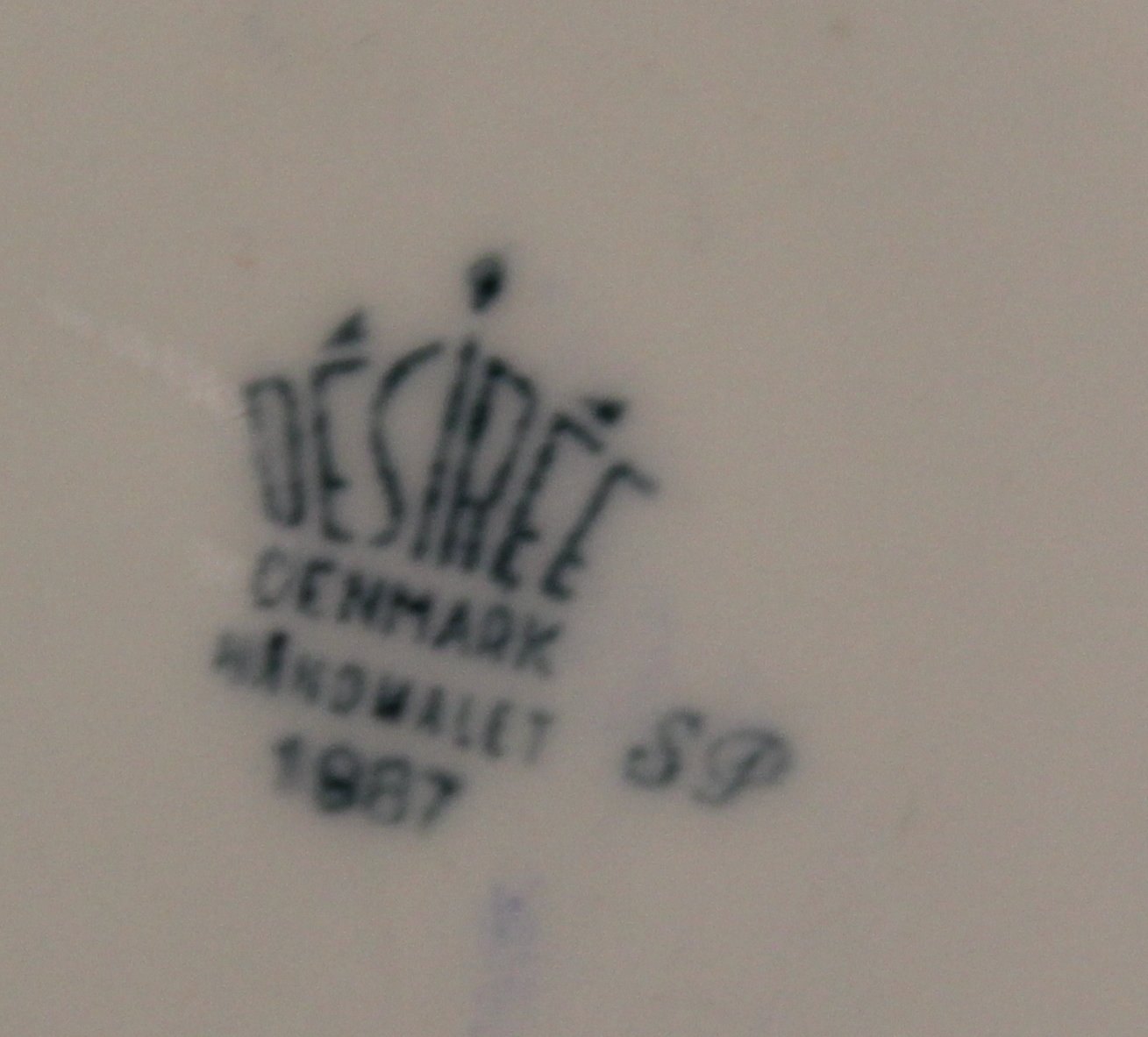 Kaffekop 6 x 8 cm & underkop 13 cm Mistelten. Desiree Stellets runde former er dækket med en silkeblød glasur og håndmalet med er lys almueblå farve lagt under glasuren.