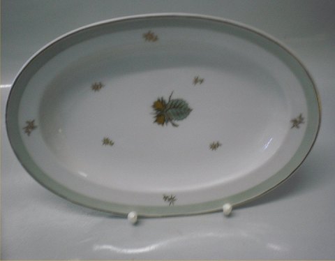 018 Ovalt fad 24 cm (318) Hasselnød Bing & Grøndahl B&G : Hvidt porcelæn, hasselnødder i guld, grønne blade, grønt bånd og guldkant, form 601 Helsingør I fin og hel stand. Hazelnut - Haselnuss