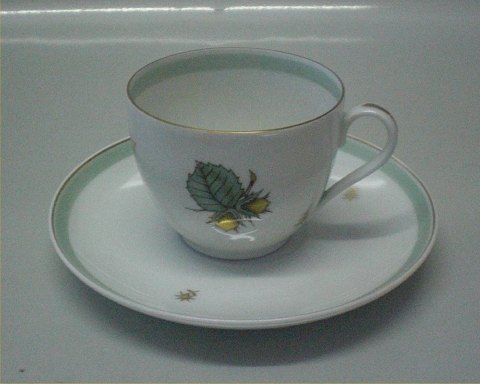 475 Chokolade kop 1,5 dl (103) Hasselnød Bing & Grøndahl B&G : Hvidt porcelæn, hasselnødder i guld, grønne blade, grønt bånd og guldkant, form 601 Helsingør I fin og hel stand. Hazelnut - Haselnuss