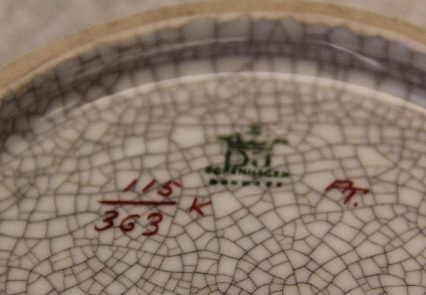 Beskrivelse: Dahl Jensen115-363 DJ Skål med decoration i brun, rød og gold på grå 7 x 26 cm . Mærket med kongelig krone og DJ Copenhagen i hel og fin stand.