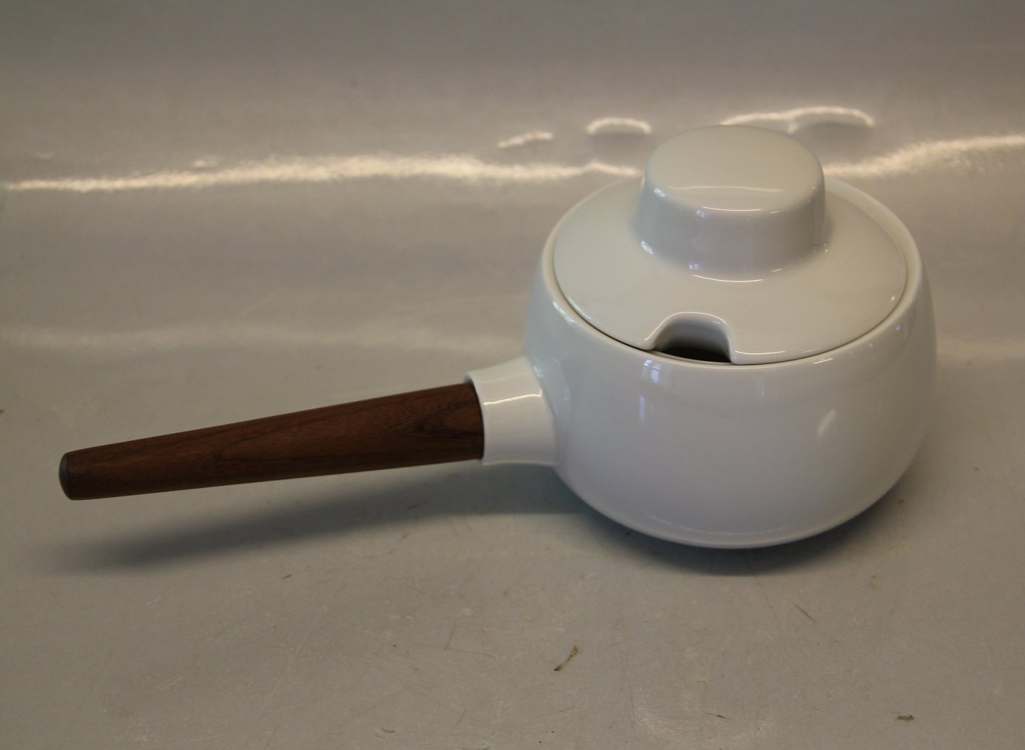 Beskrivelse: 515 Sovsekande med træhank og låg 9 x 27 cm Bing & Grøndahl Hvid Henning Koppel I fin og hel stand Bing & Groendahl