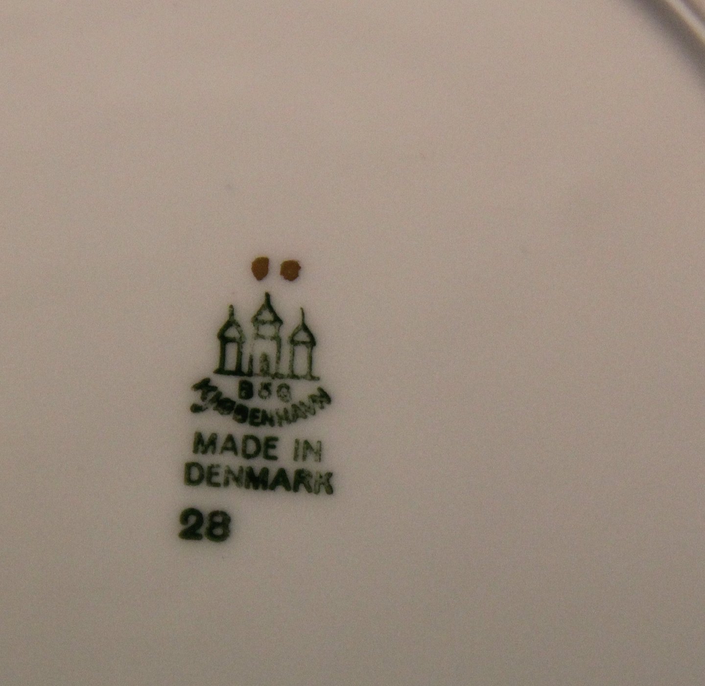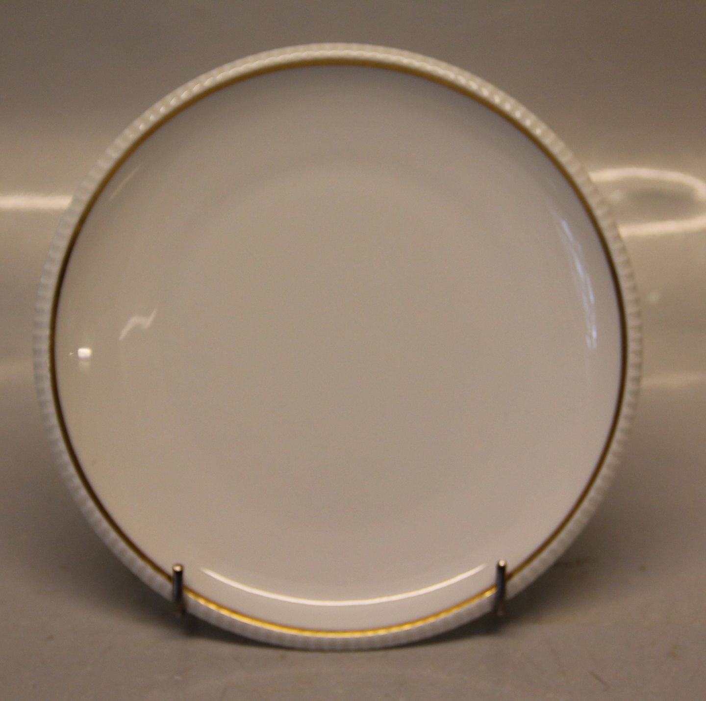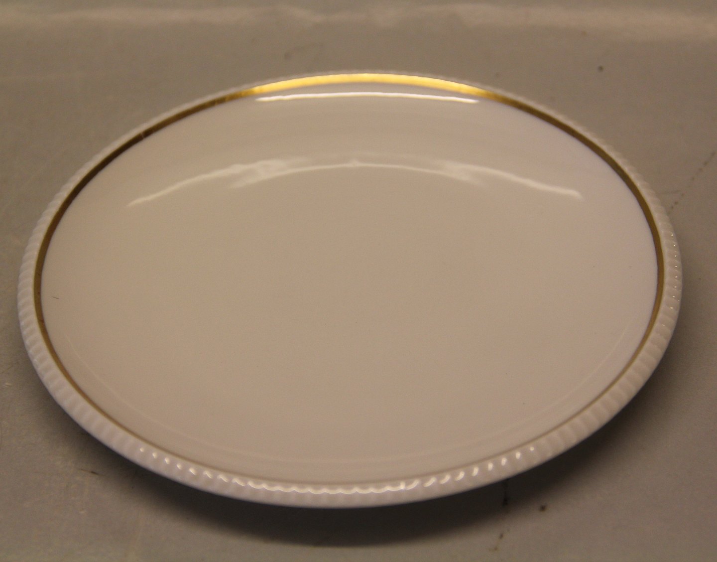 028 Sidetallerken 17 cm Vega B&G med smal guldbelægning på inderkanten . Form 674 er formgivet af Sigward Bernadotte. Denne form findes i hvidt, med bred guldkant (Gylden Sol), med grønt og guld (Perseus), med rødt og guld (Herkules) og beige og guld (Norma).