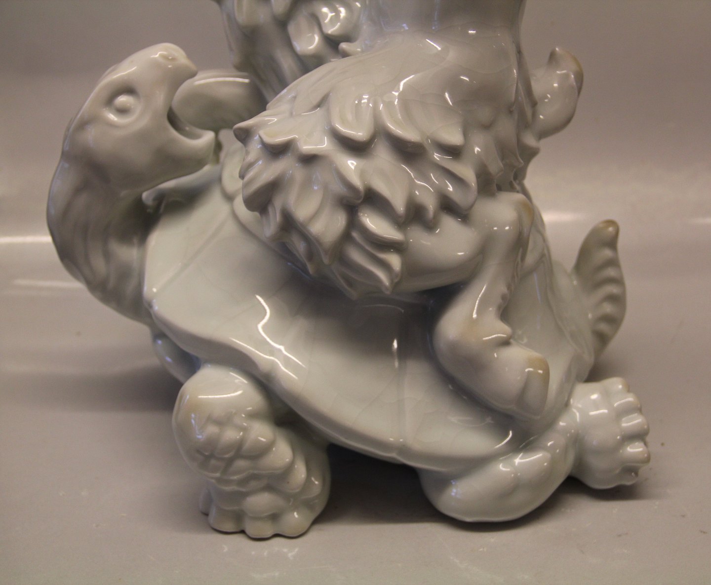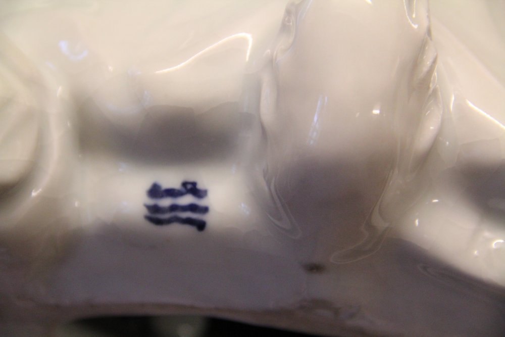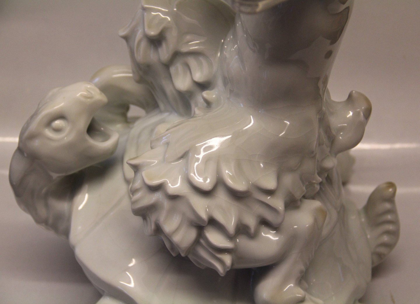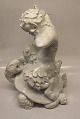 Beskrivelse: 3082 Faun med skildpadde KK 1929 46,5 x 32 cm Royal Copenhagen stentøj Hvid Craquelé I fin stand