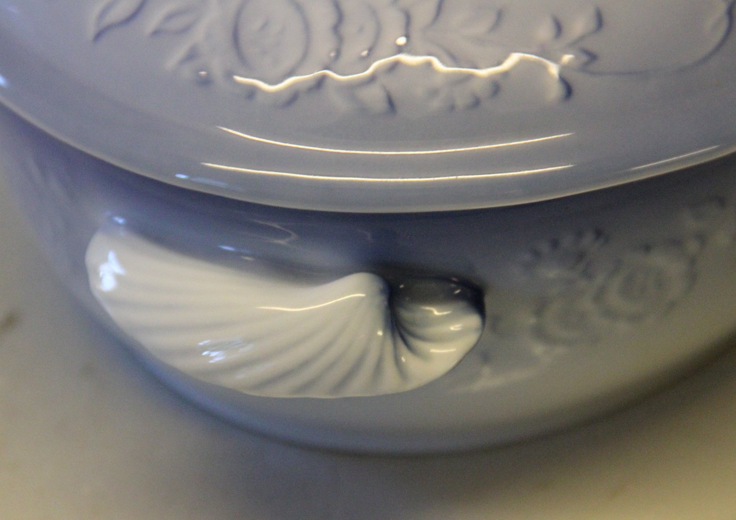 2517-13003 Lågfad ca 14 x 27 cm Royal Copenhagen blåt porcelæn med blå blomsterranke i relief. I fin og hel stand