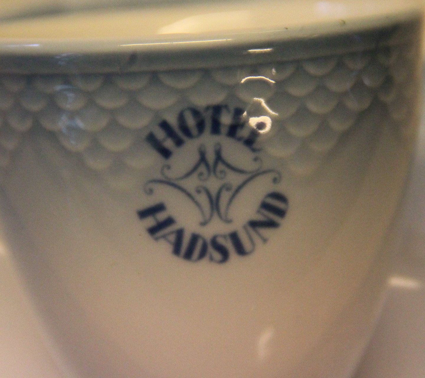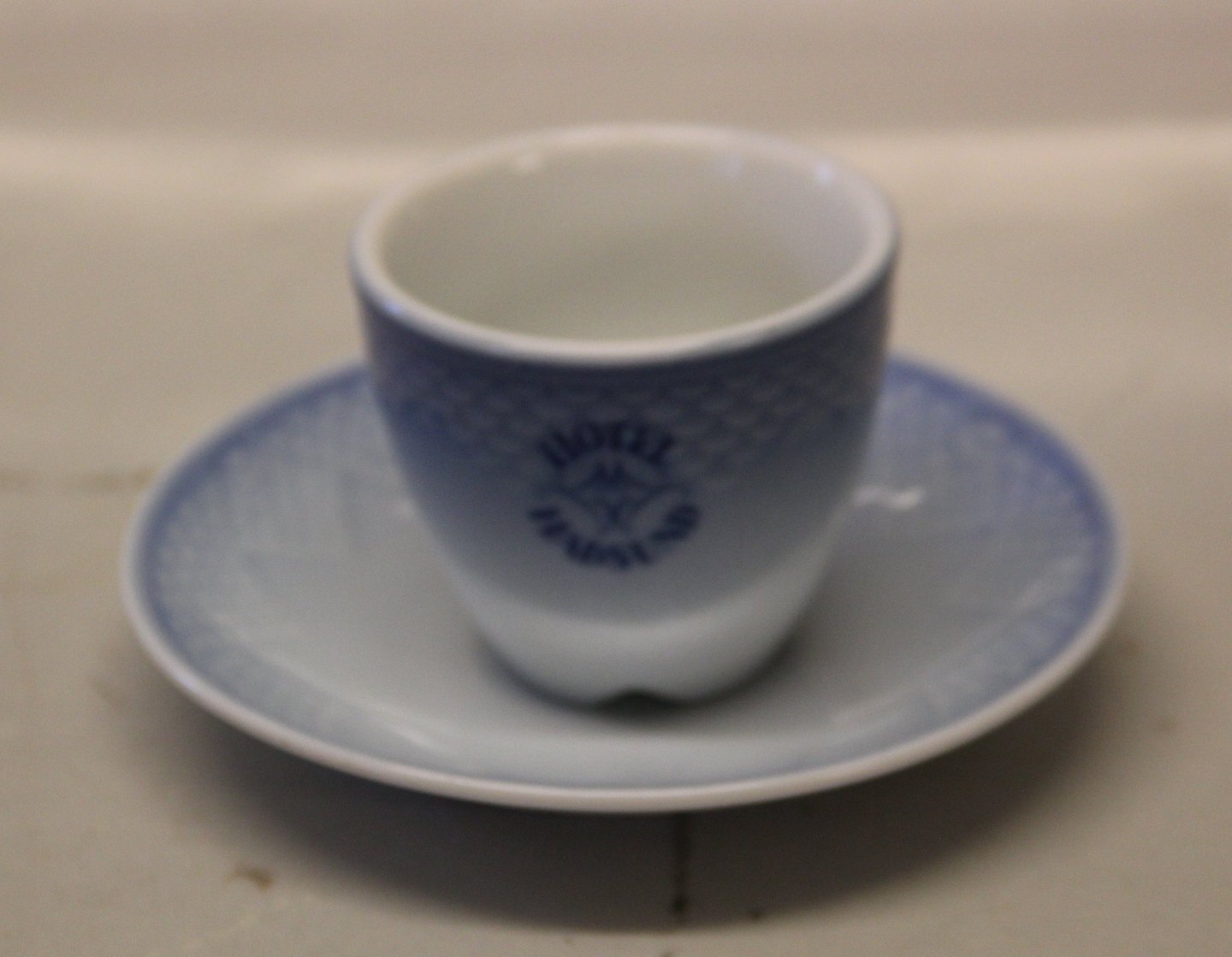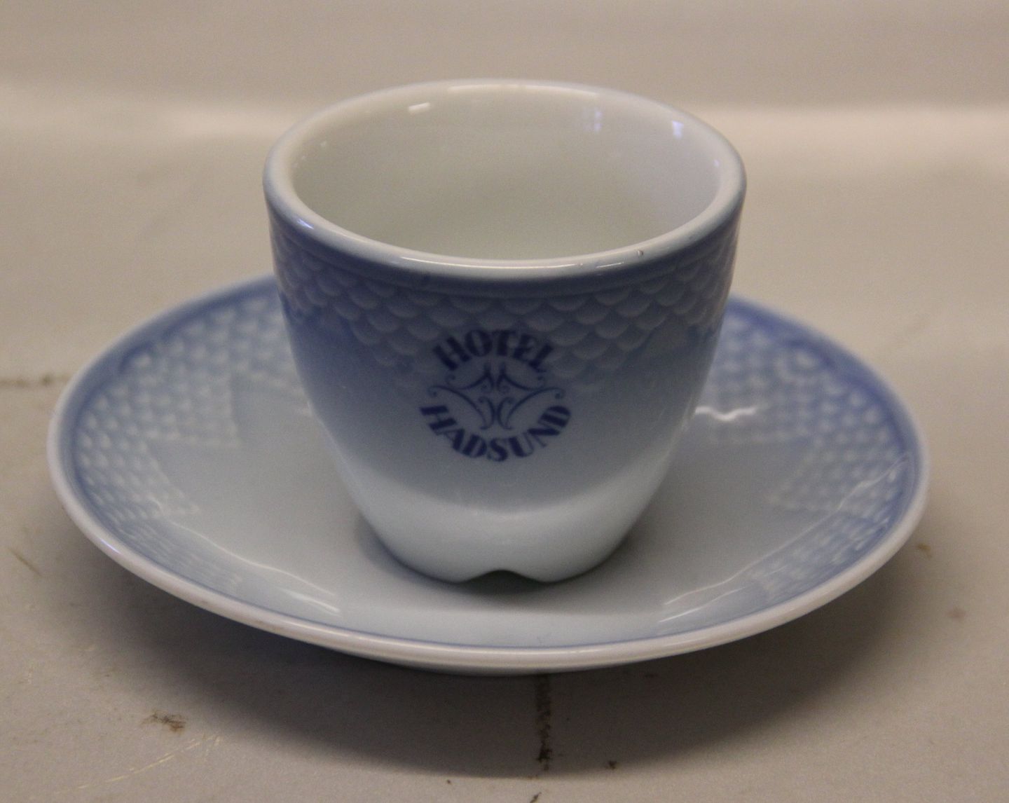 1021 Mokkakop 5,5 cm og underkop 12 cm Logo (740) Hotel Hadsund Bing & Grøndahl Blå tone eller musling Hotelporcelæn