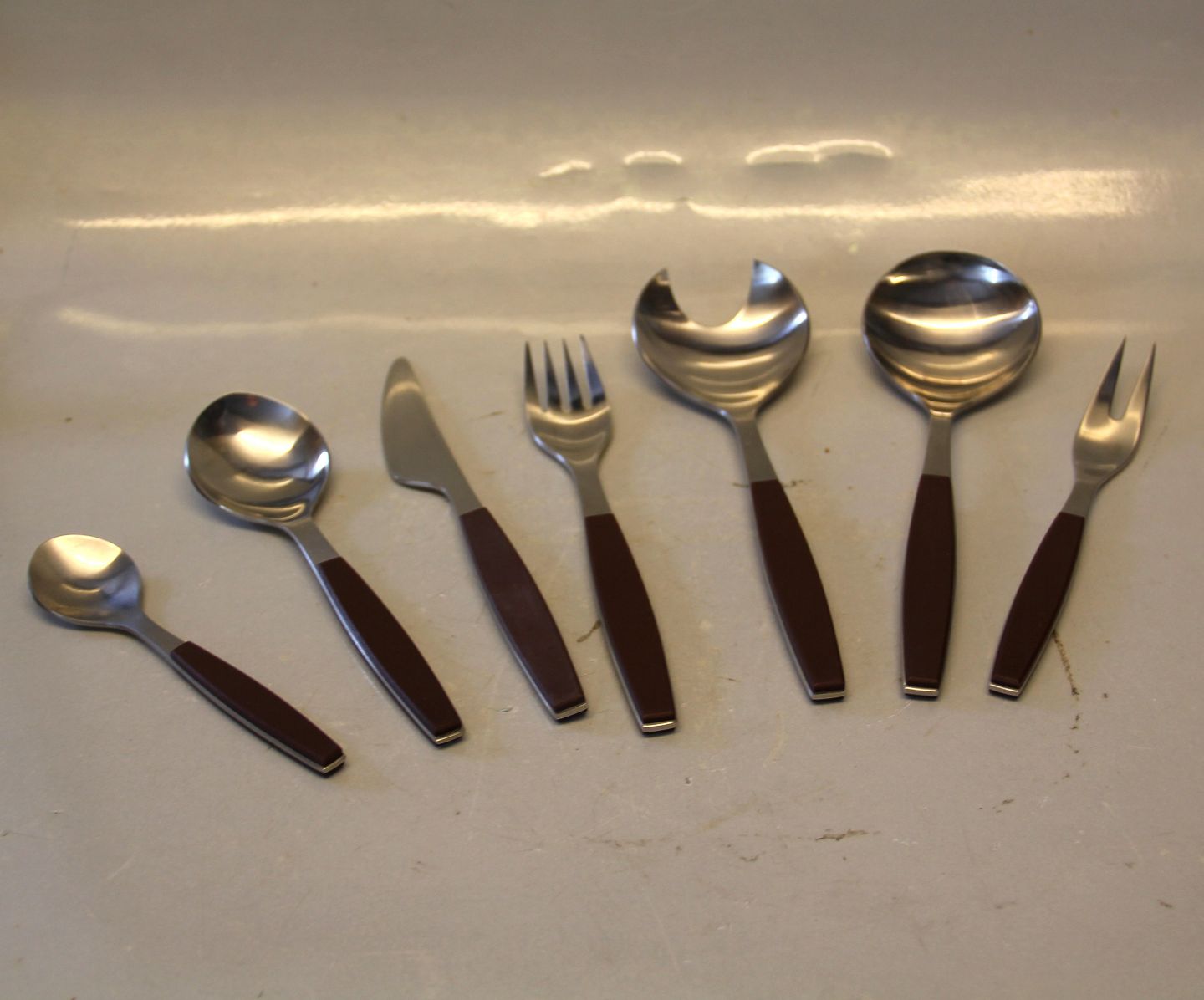 : Henning Koppel. Strata bestik af rustfrit stål og brun plast Fremstillet hos Georg Jensen: