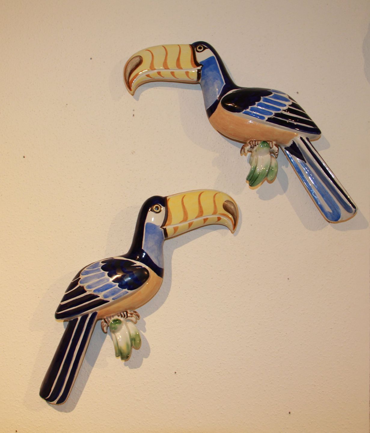 Beskrivelse: Royal Copenhagen Aluminia fajance væghængte Toucaner Design Jeanne Grut Ca 50 cm fra halespids til næp. Se den i vores Fugleudstilling 2018 i Mariager