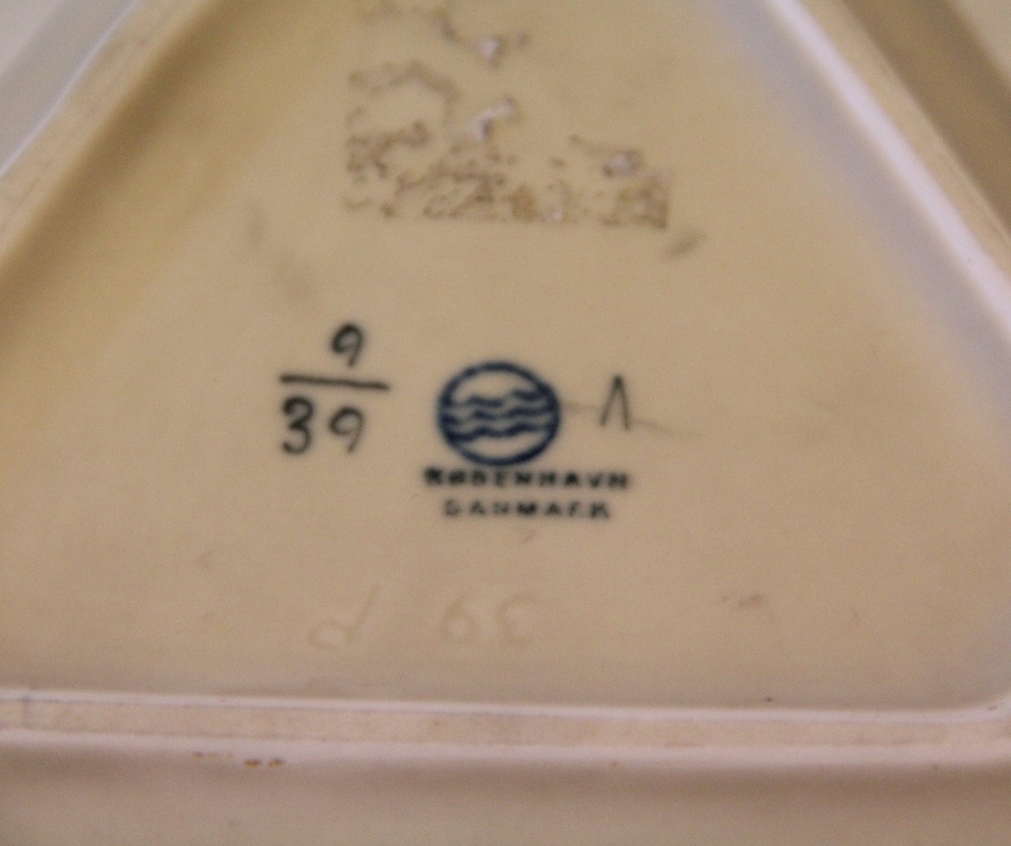 Aluminia kunst Mat Porcelain 9-39 Kgl. Trekantet fad med hjortekid 15 x 13.3 cm 1927