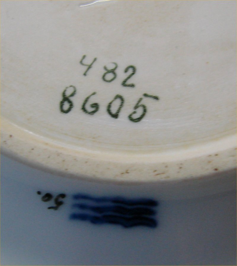Strøblomster - på samme stelform som blå Blomst Kantet der blev re-designet af Arnold Krog i 1912-1913. Så den tidligst datering er omkring 1914. Af en eller andet grund er mange dele i denne serie mærket kun med de tre bølgelinjer - men det betyder ikke at de er fra før 1894