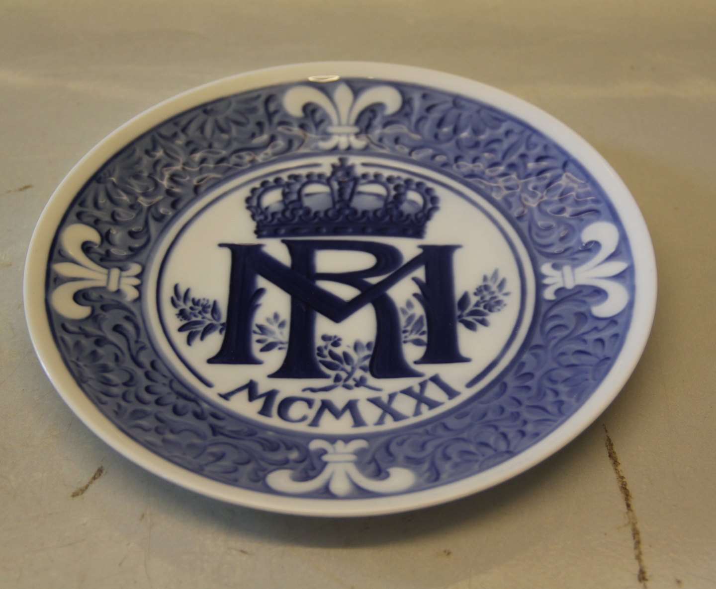 Beskrivelse: RCM 200: 1921 Prinsesse Margrethes bryllup med prins Rene af Bourbon Parma. Kronede initialer MR MCMXXI, i borten franske liljer. Design: Oluf Jensen : 17,5 cm