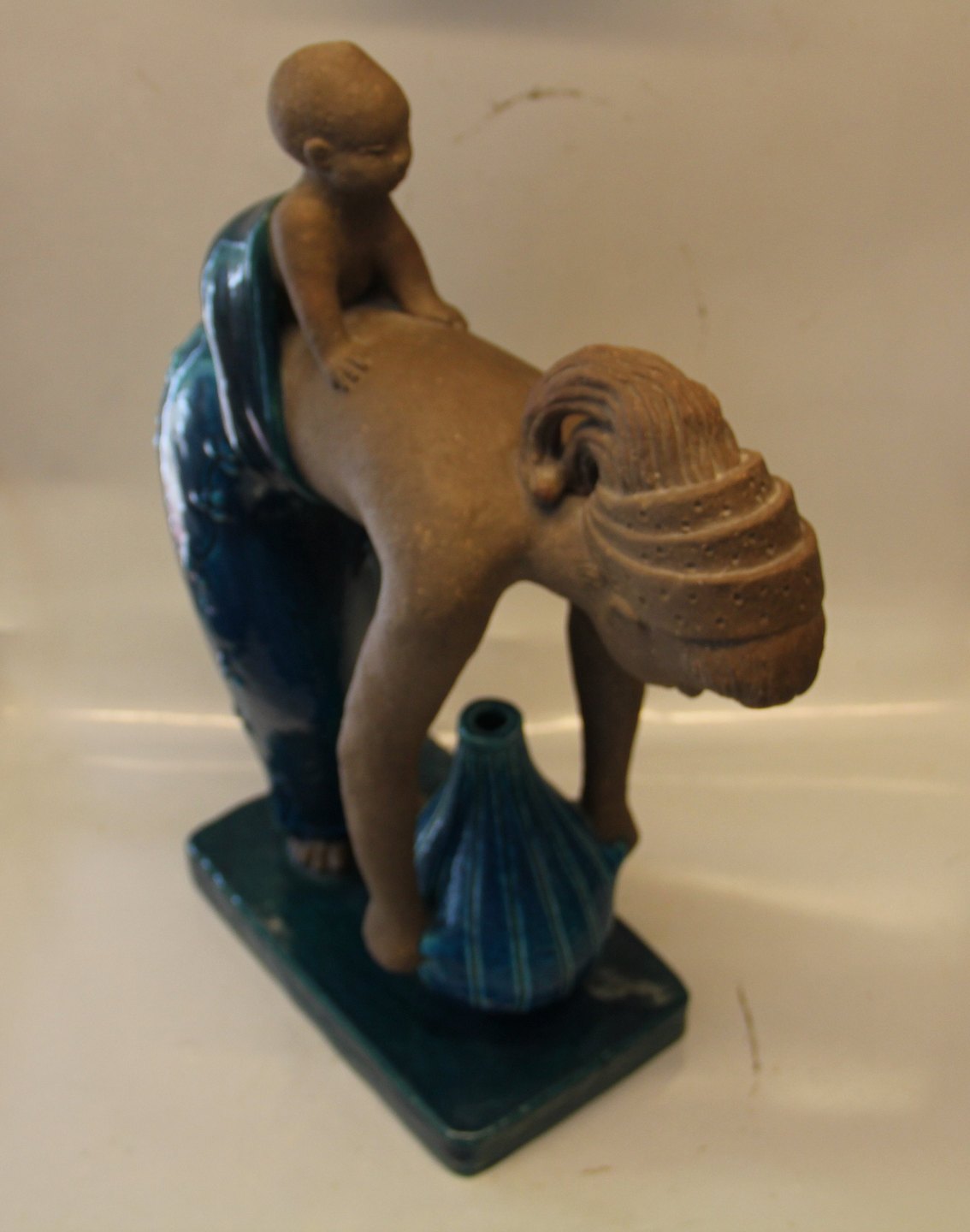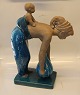 Beskrivelse: Royal Copenhagen Johannes Hedegaard stentøj chamotte og turkisblå glasur 21459 Kgl. Mor og barn, JH, maj 1957 45 x 34 cm 11/15 I fin og hel stand