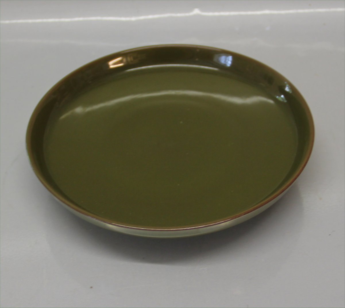 2829 Skål på lav fod 4 x 21,5 cm salatskål, lågfad, kagefad Royal Copenhagen Aluminia fajance Timiana (Grøn) 1960-1969 på spisestelstelform Prunella designet af arkitekt Magnus Stephensen 1958
