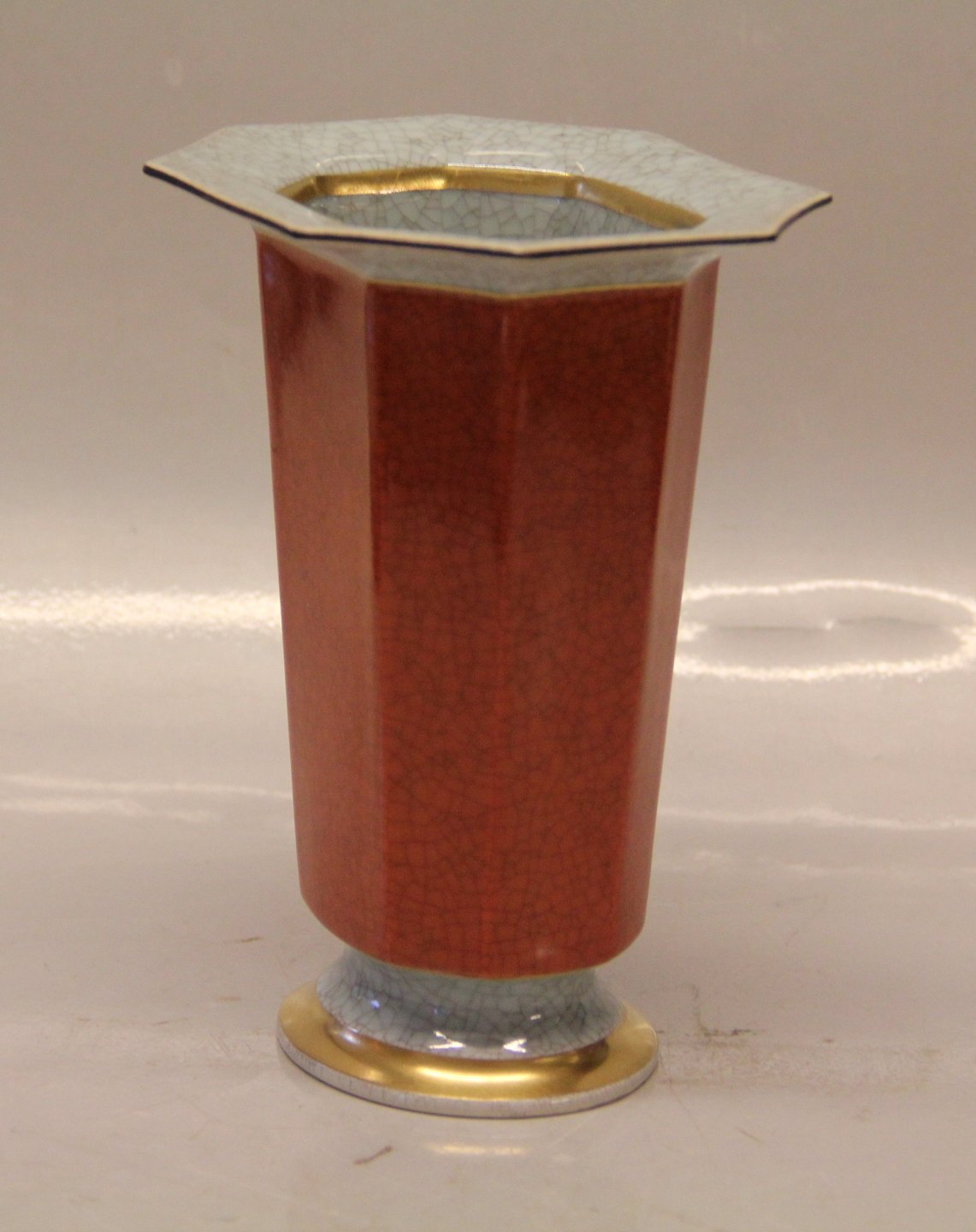 Beskrivelse: 212-2504 Kgl. Vase rød, grå og guld 17 x 13.5 ottekantet Kgl. Craquelé fra Royal Copenhagen I hel og fin stand