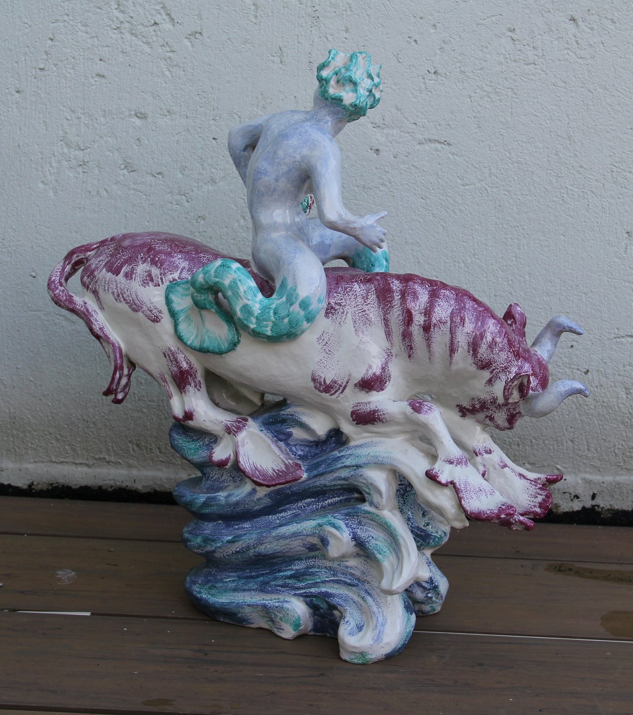 Bing & Grøndahl J. R. Gauguin: Figurgruppe af polykromt glaseret roche céramique / fajanace Havfrue ridende på "Hav" Tyr ca 65 cm høj