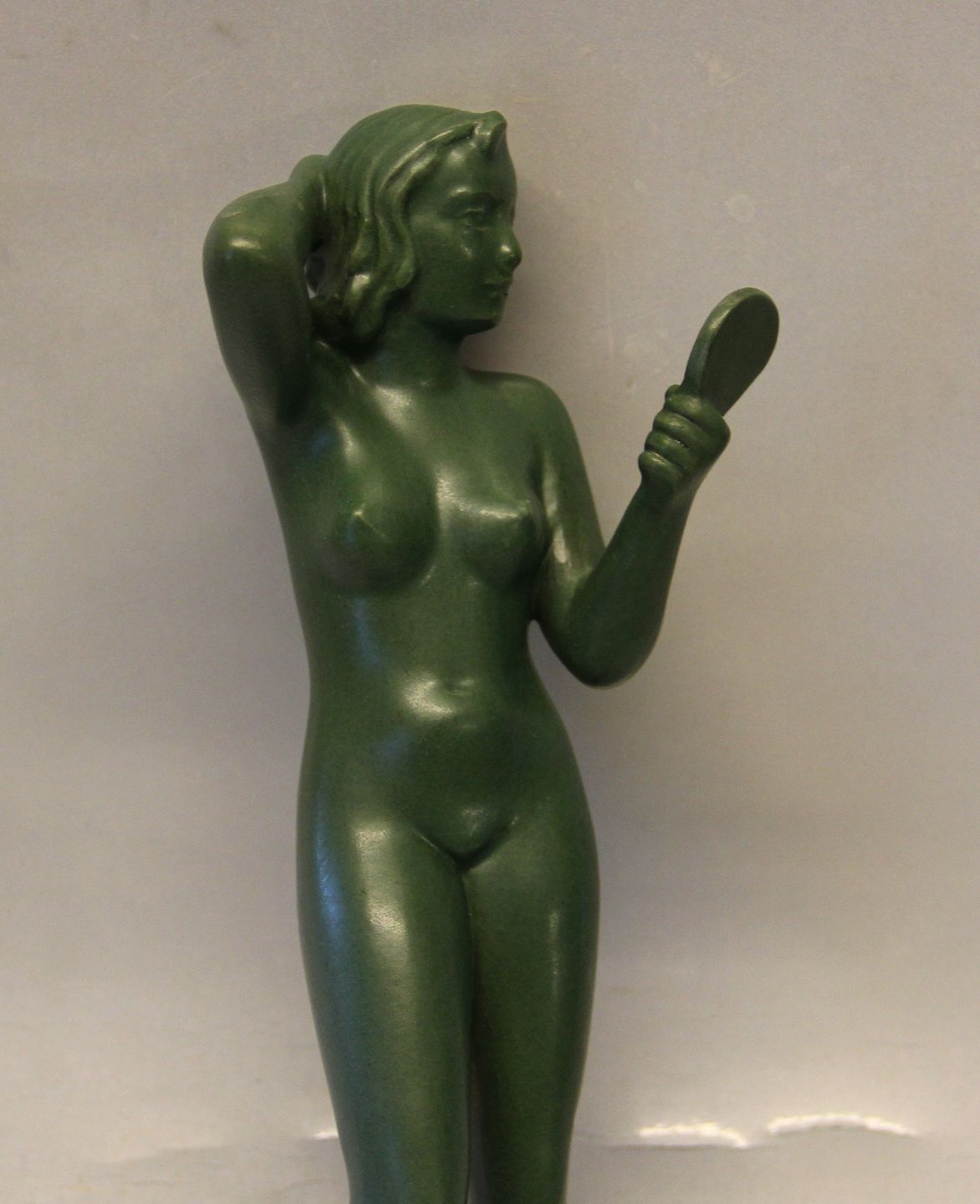 Beskrivelse: Jadegrøn 931 V Håndspejlet - Kvinde med spejl ca 22 cm Volmer Bahner Keramik fra P. Ipsens Enke Kgl. Hof. Terracottafabrik 1843-1955