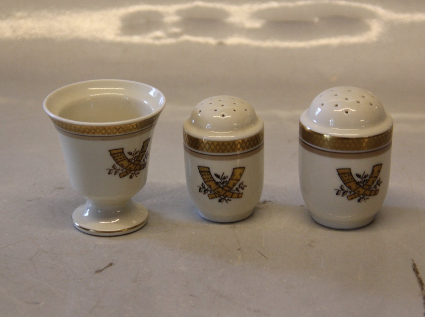 9728 Egg cup 6 cmGuldhornene spise- og kaffestel fra Den kongelige Porcelænsfabrik. Som Liselund på creme porcelæn med Guldhornene, kristtjørn og ciseleret guldkant. I fin og hel stand Design Thorkild Olsen. Flere dele med inskription fra I.C. Hempel 1940 - 1950.