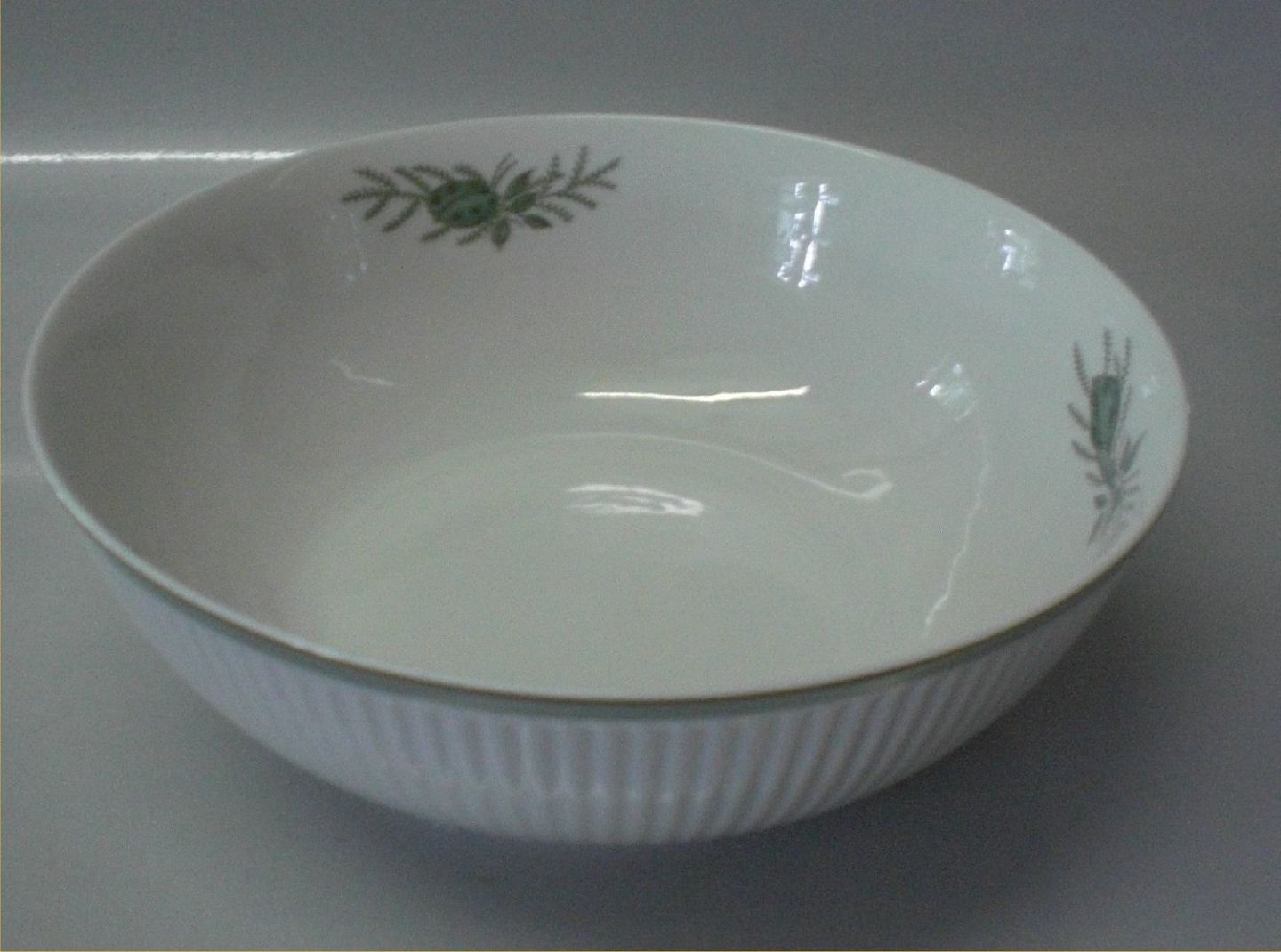 1513-14968 Skål 7,5 x 21,5 cm Grøn Melodi #1513 (Kgl.) Rillet form, hvid glasur, grøn dekoration, grønt båd og guldfilet.