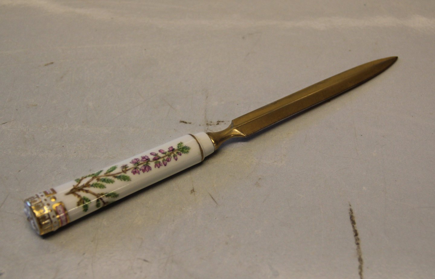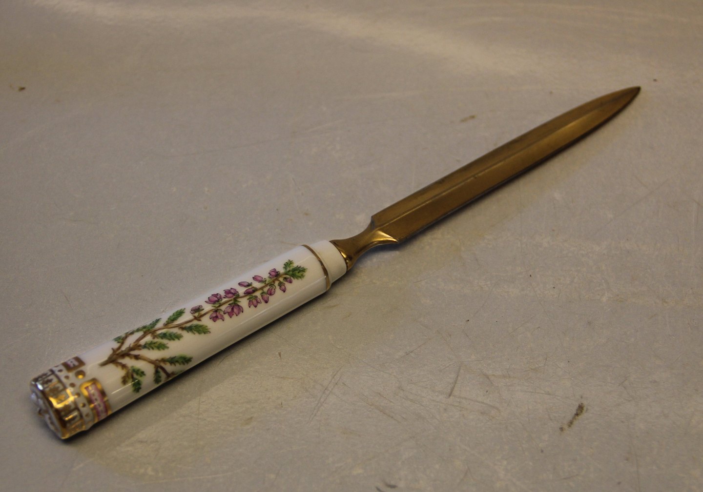 Beskrivelse: Royal Copenhagen Flora Danica Brevkniv 23 cm forgyldt knivblad let slid på forgyldning