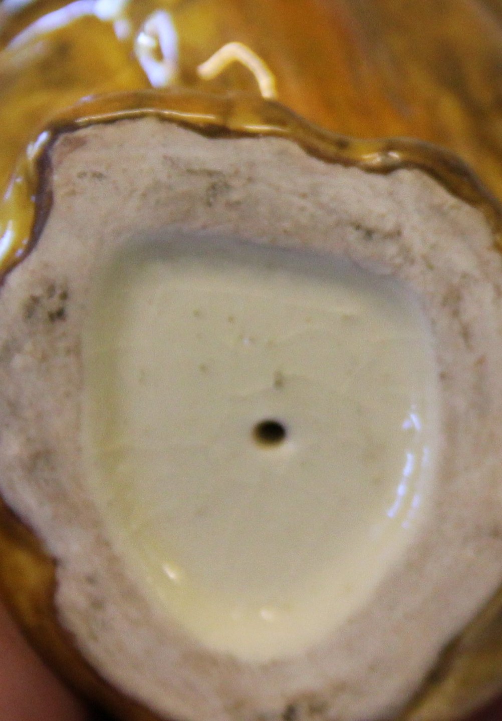 Beskrivelse: Gulglasseret abekat11 cm Sandsynligvis Knud Kyhn fra hans eget værksted i Farum