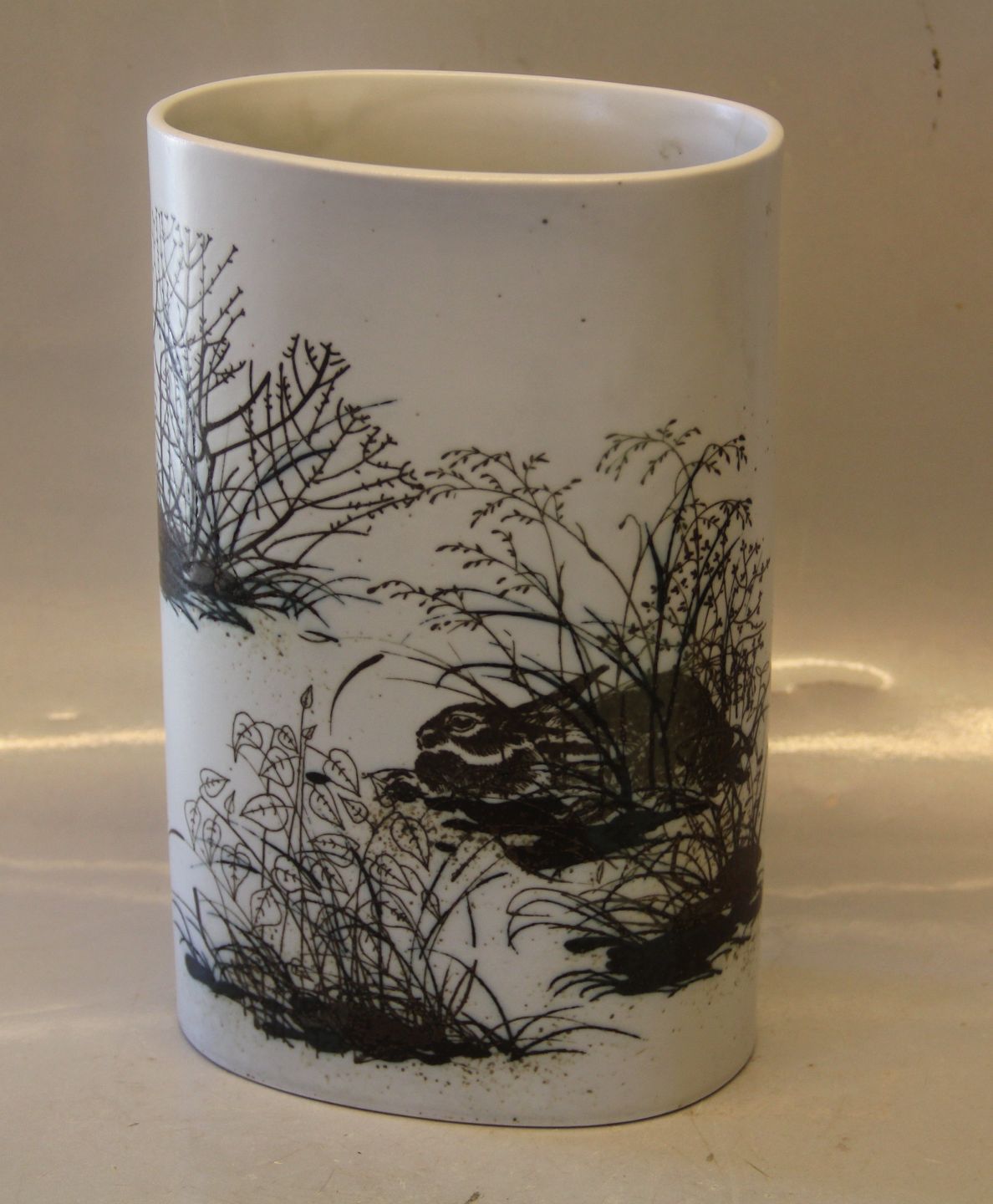 Beskrivelse: 1104-5405 Kgl. Aluminia Diana Stentøjsvase med harer 12.2 cm Nils Thorsson Royal Copenhagen Aluminia Diana fajance