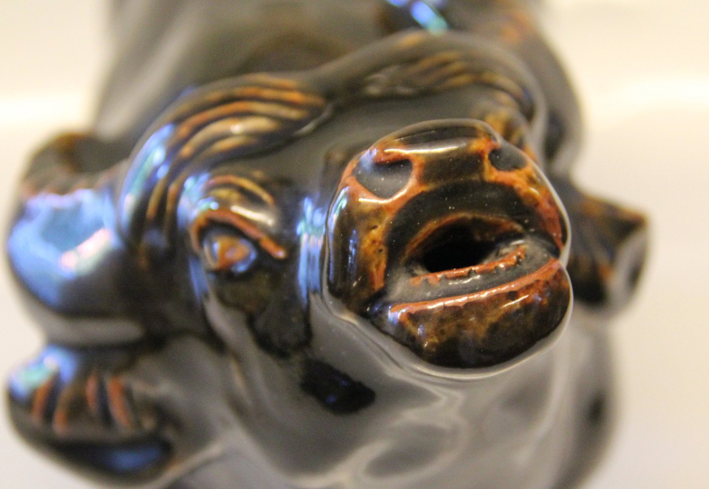 Beskrivelse: Olivin Glasur Royal Copenhagen stentøj 20144 Kgl. Tyr 20 x 31 cm Knud Kyhn august 1927 I fin og hel stand