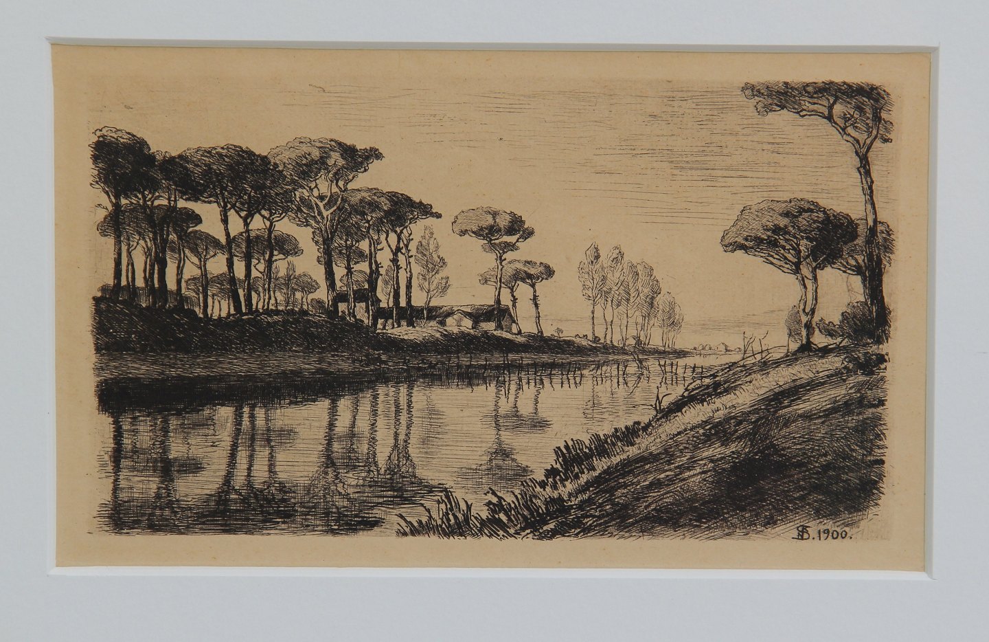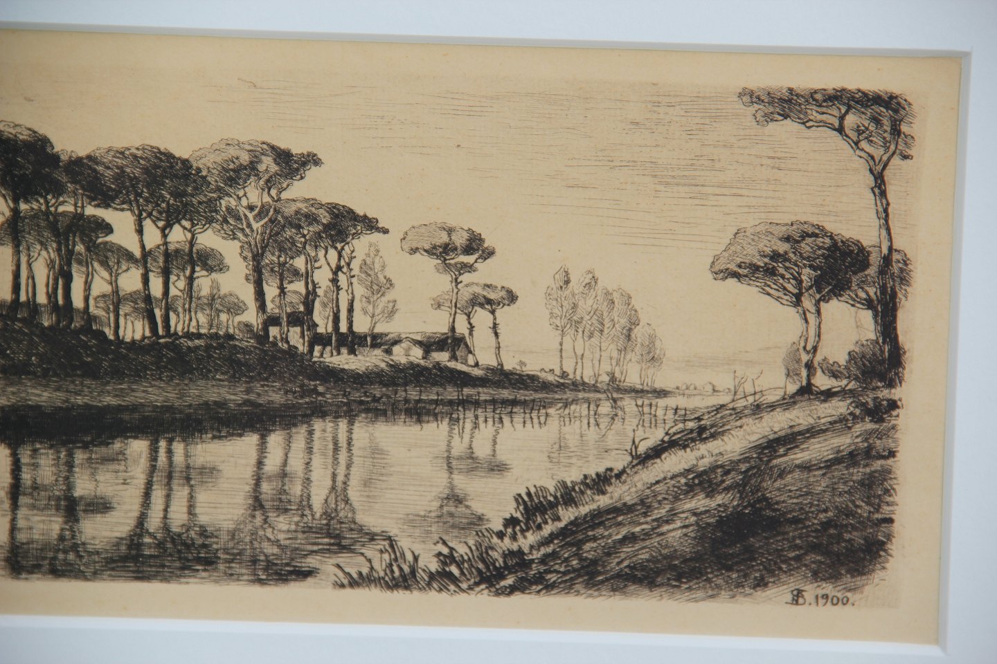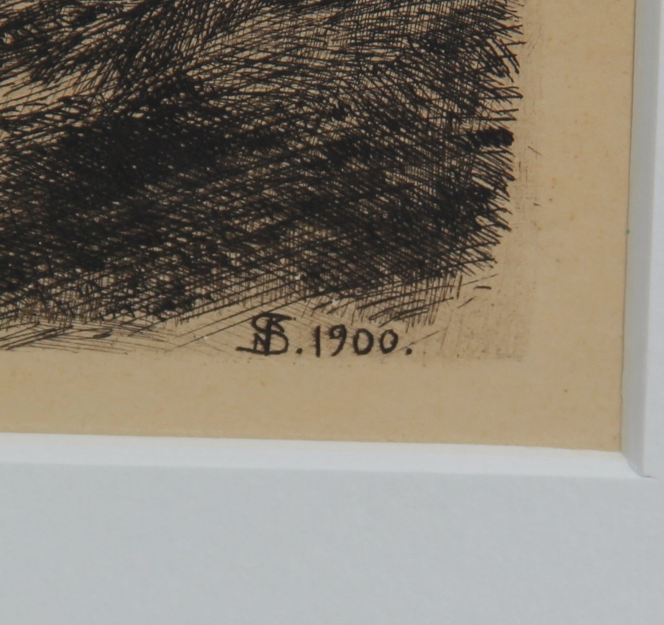 Radering: Skovgaard 1900 Landskab ved sø 25 x 33.5 cm i guldramme