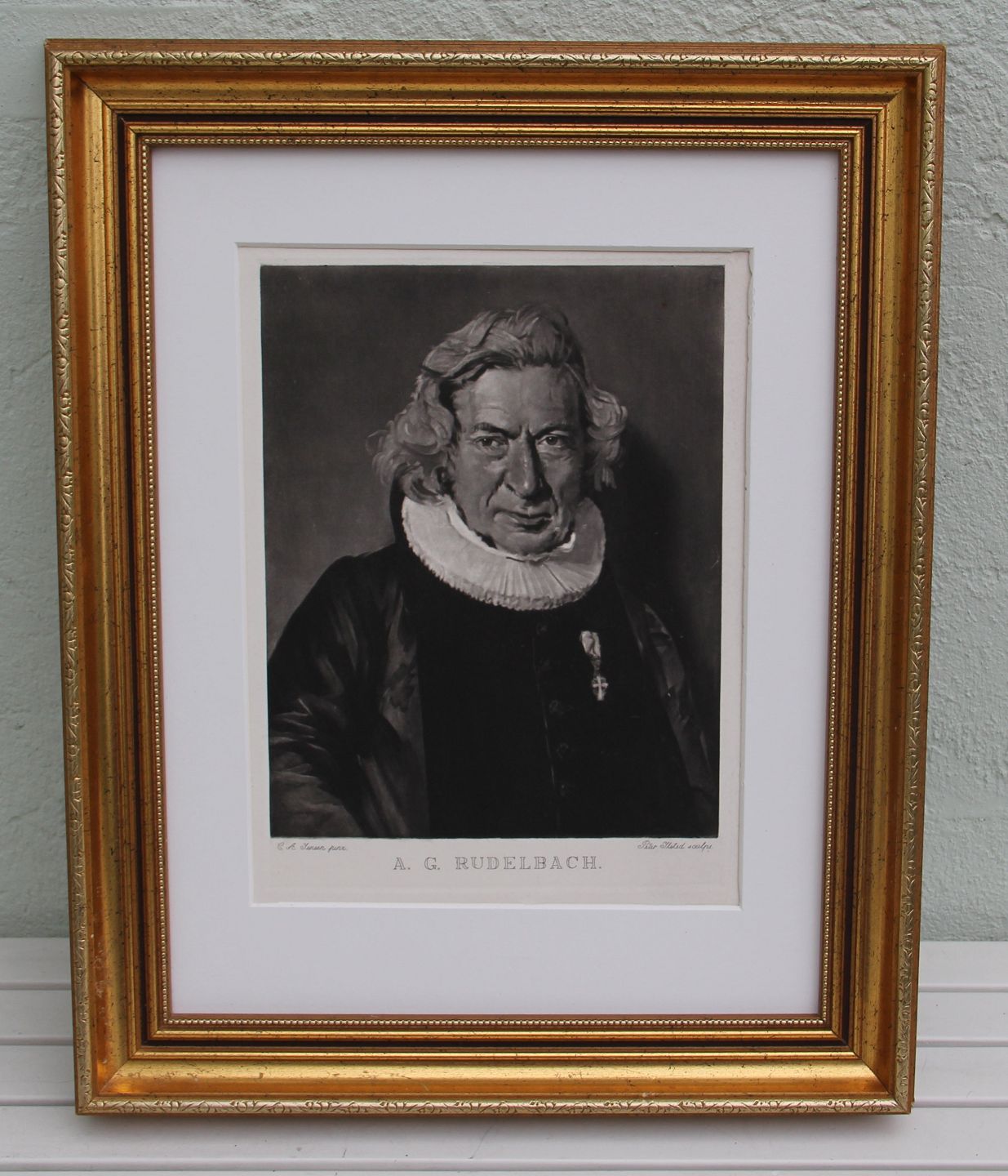 Mezzotinte: Opus 64.Teologen A. G. Rudelbach efter maleri af C.A. Jensen 1930 C. A. Jensem pinx. Peter Ilsted sculps. A.G. Rudelbach. Stemplet D.D.R.F (Den Danske Raderer Forening) 31 x 22.5 cm