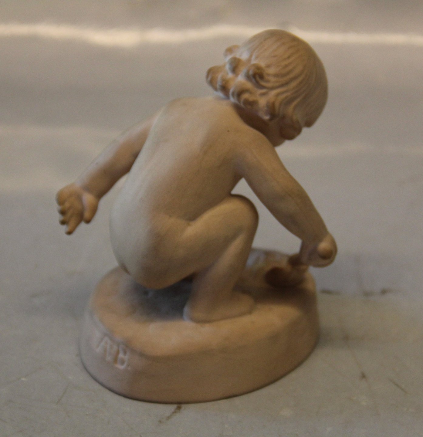 Beskrivelse: 43 Arbejdslyst (Pige med skovl) Adda Bonfils 13,5 cm 889 glasur Keramik fra P. Ipsens Enke Kgl. Hof. Terracottafabrik 1843-1955