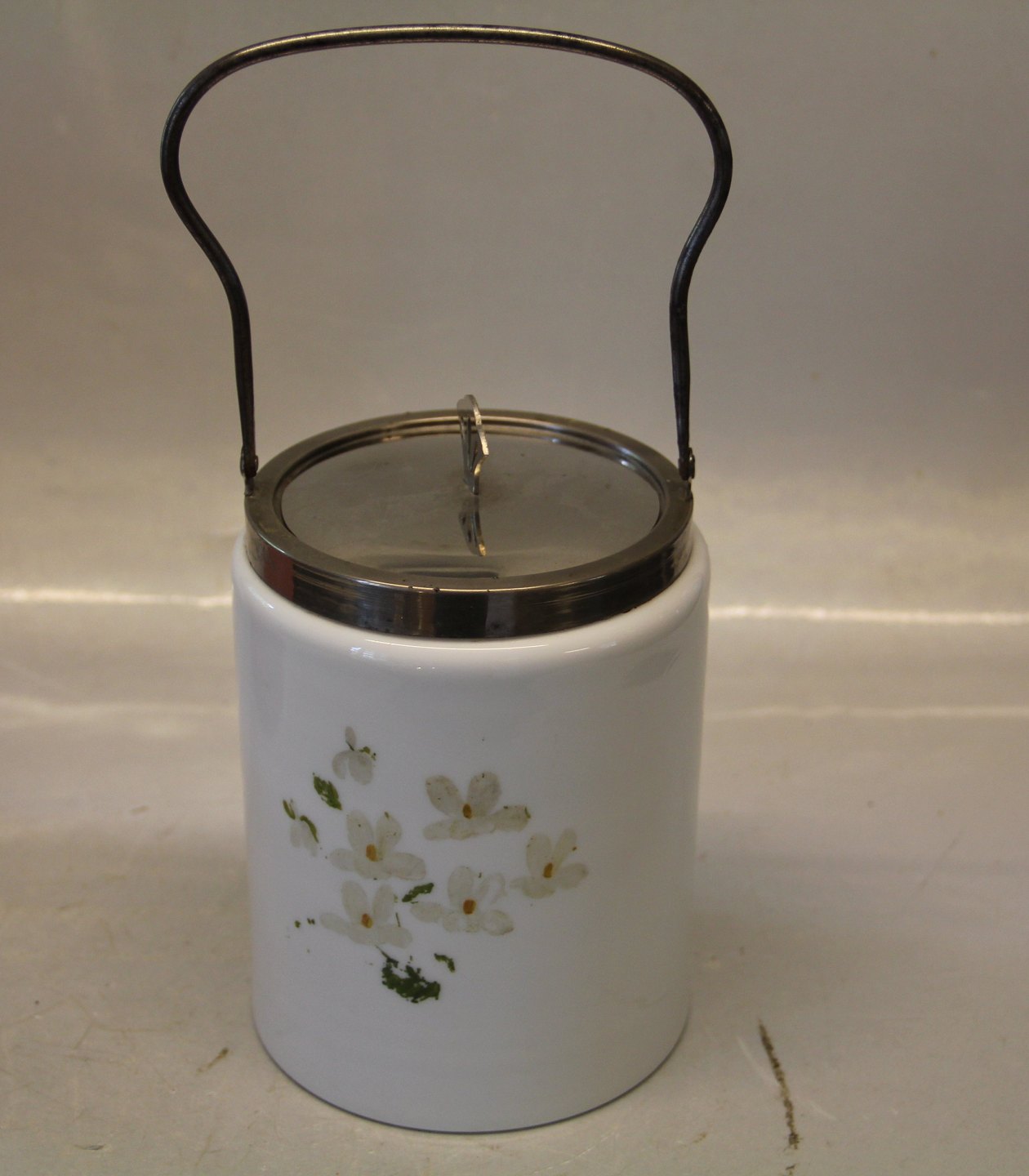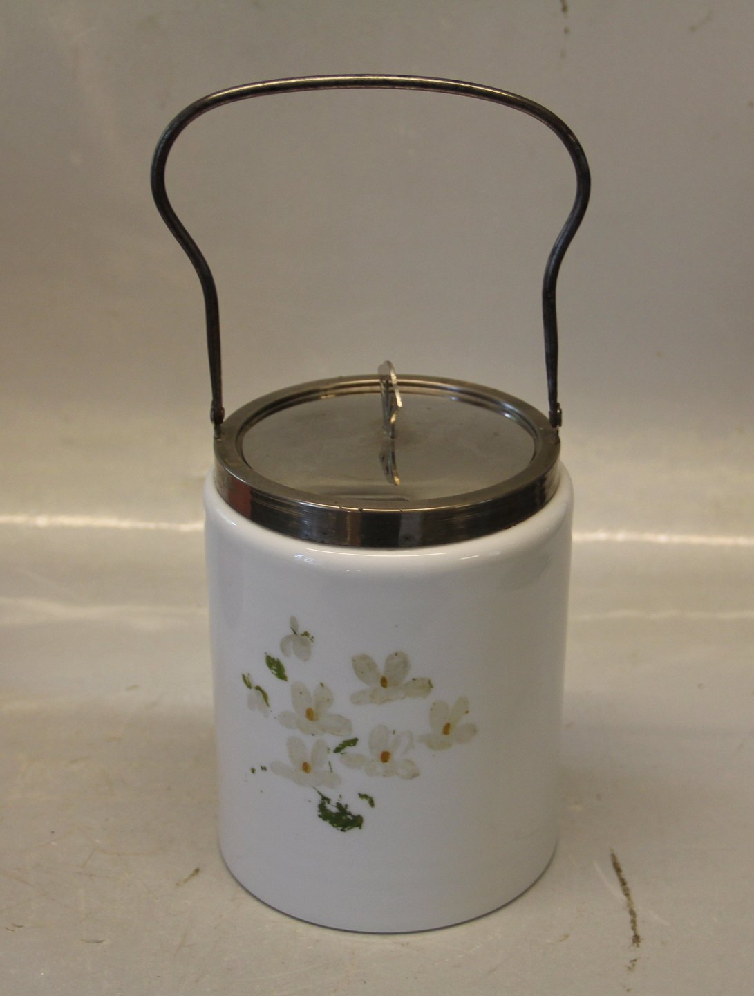 Beskrivelse: Gammel kiksespand med forsølvet låg - rosa fajance 5867 Made in England 17 cm høj + hank
