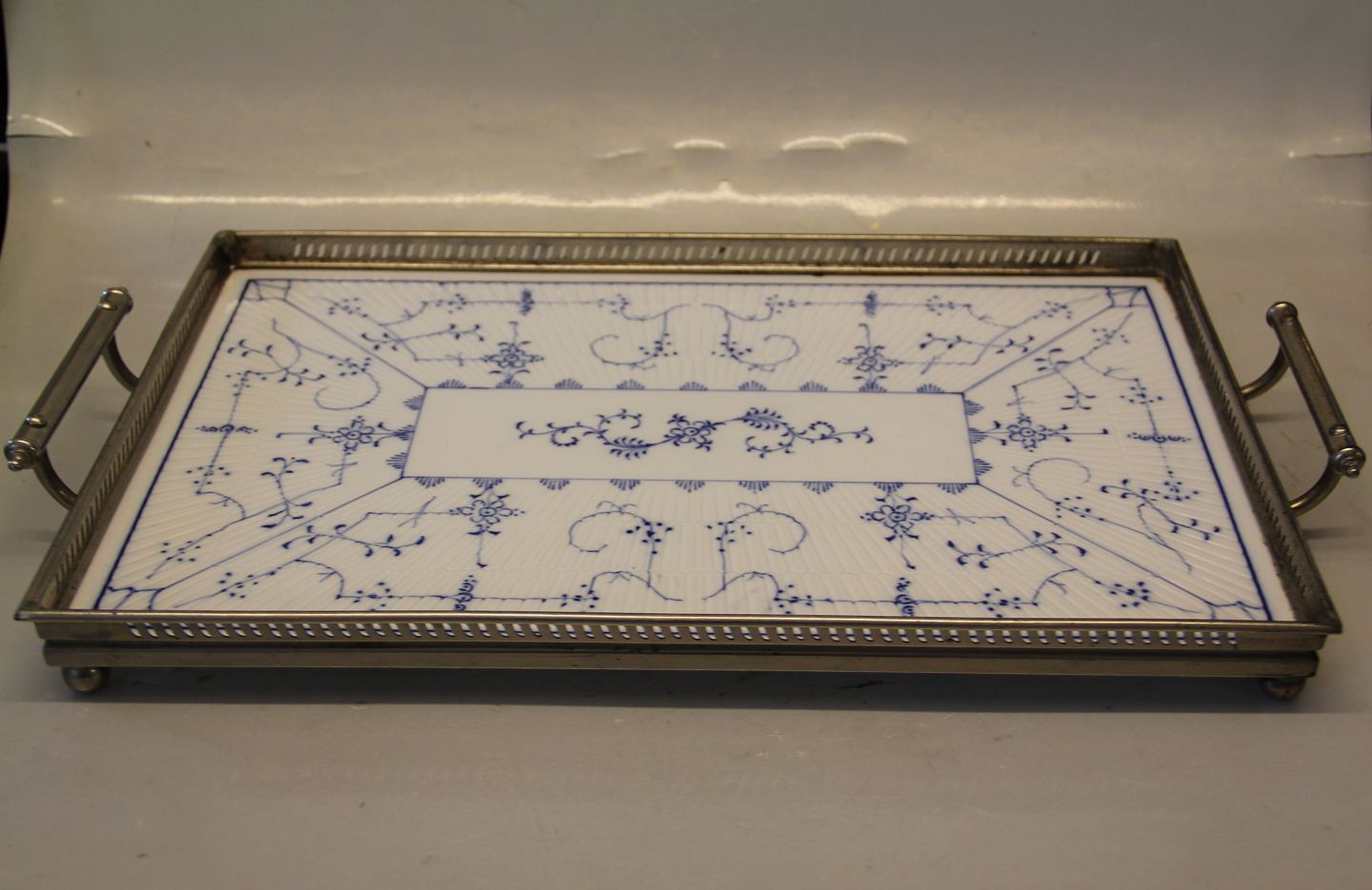 Gl. Musselmalet Fajancebakke med sølvfarvet metalstel Villeroy & Boch 26 x 39,5 cm