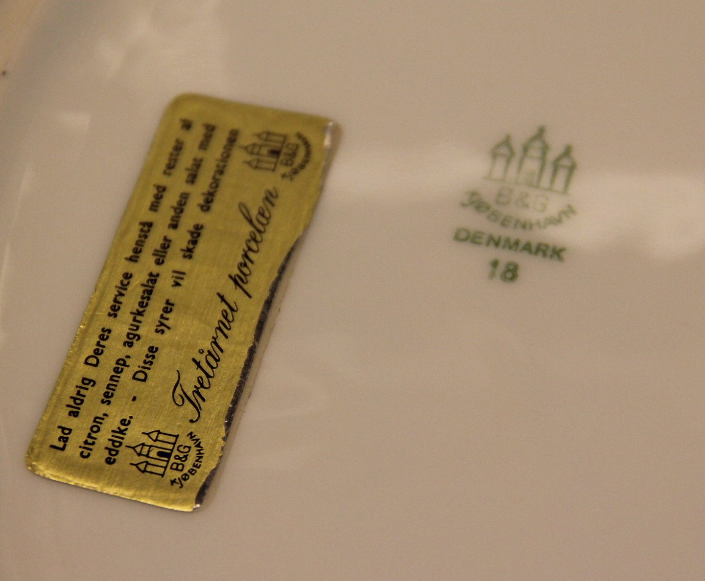 Marstrand B&G porcelæn Hvidt porcelæn, antik græsk kantet guldbort på grøn kant