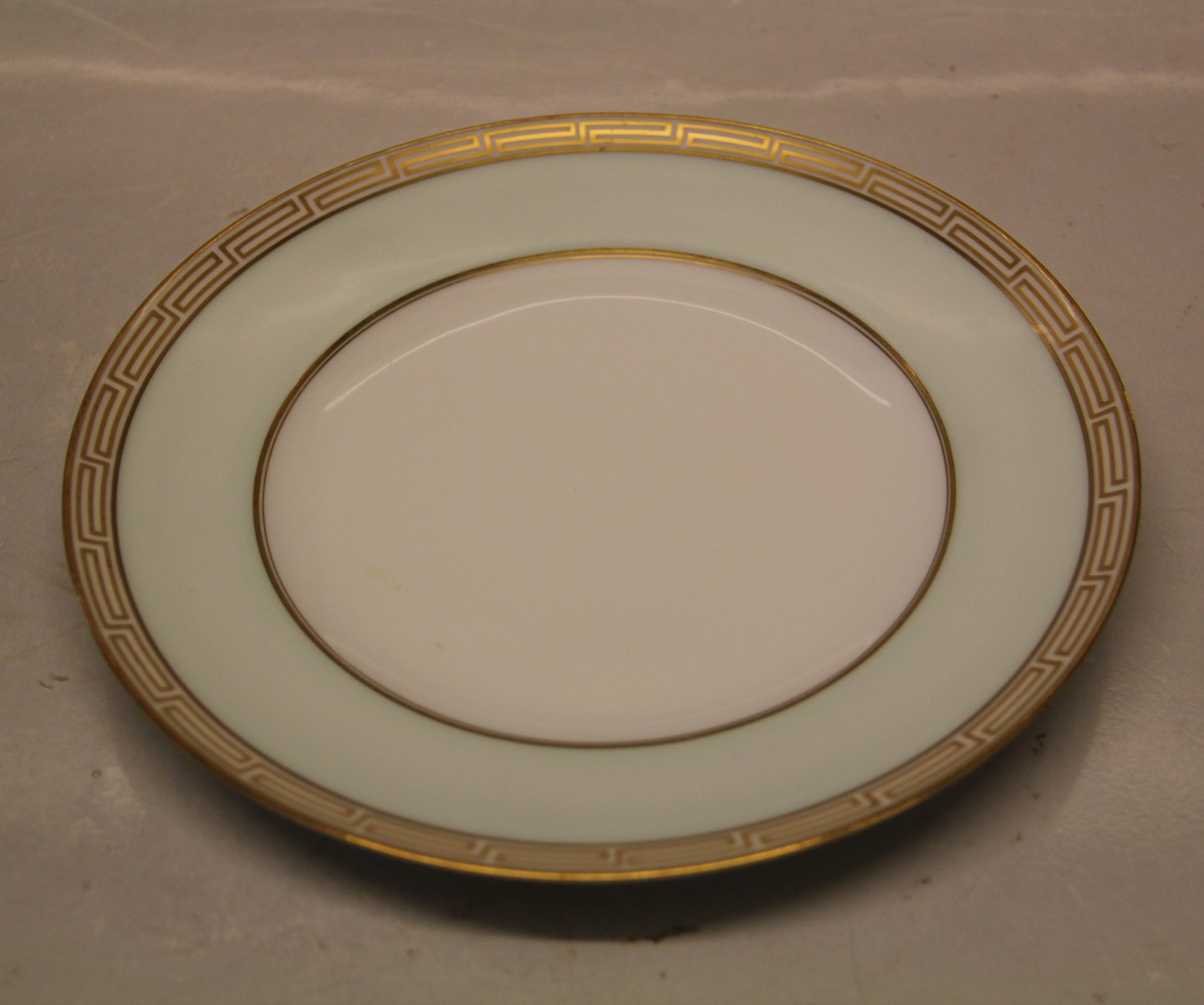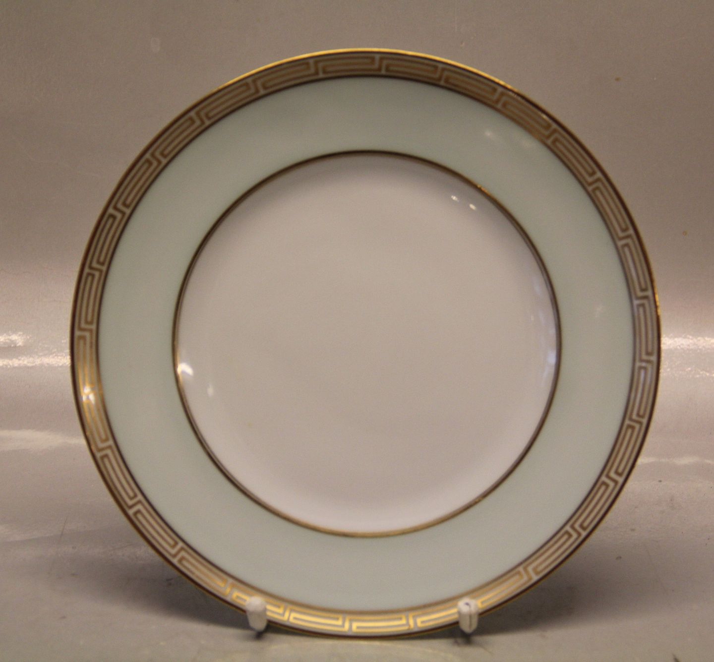 026 Frokosttallerken 21,5 cm (326) Marstrand Bing & Grøndahl B&G : Hvidt porcelæn, antik græsk kantet guldbort, pastel grøn, guldkantet spejl, form 601 I fin og hel stand Bing & Groendahl