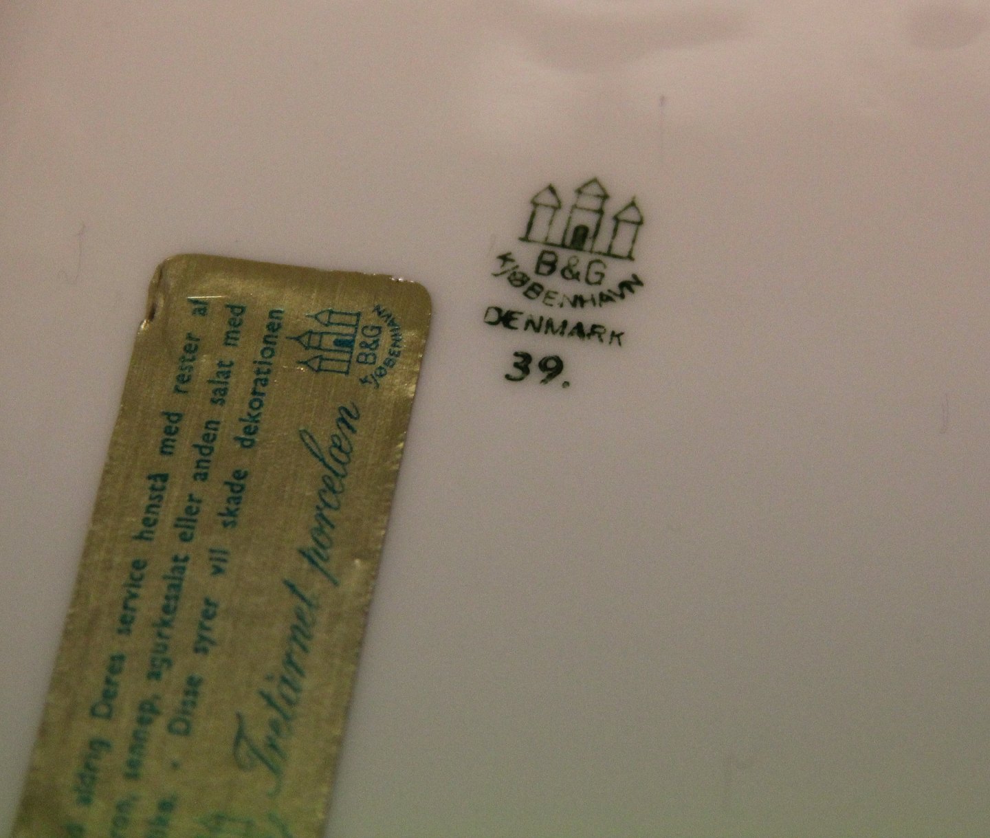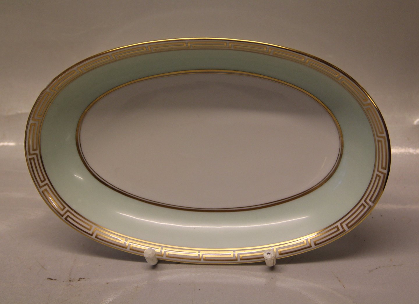 038 Ovalt Fad 17.8 x 12 cm (349) Marstrand Bing & Grøndahl B&G : Hvidt porcelæn, antik græsk kantet guldbort, pastel grøn, guldkantet spejl, form 601 I fin og hel stand Bing & Groendahl