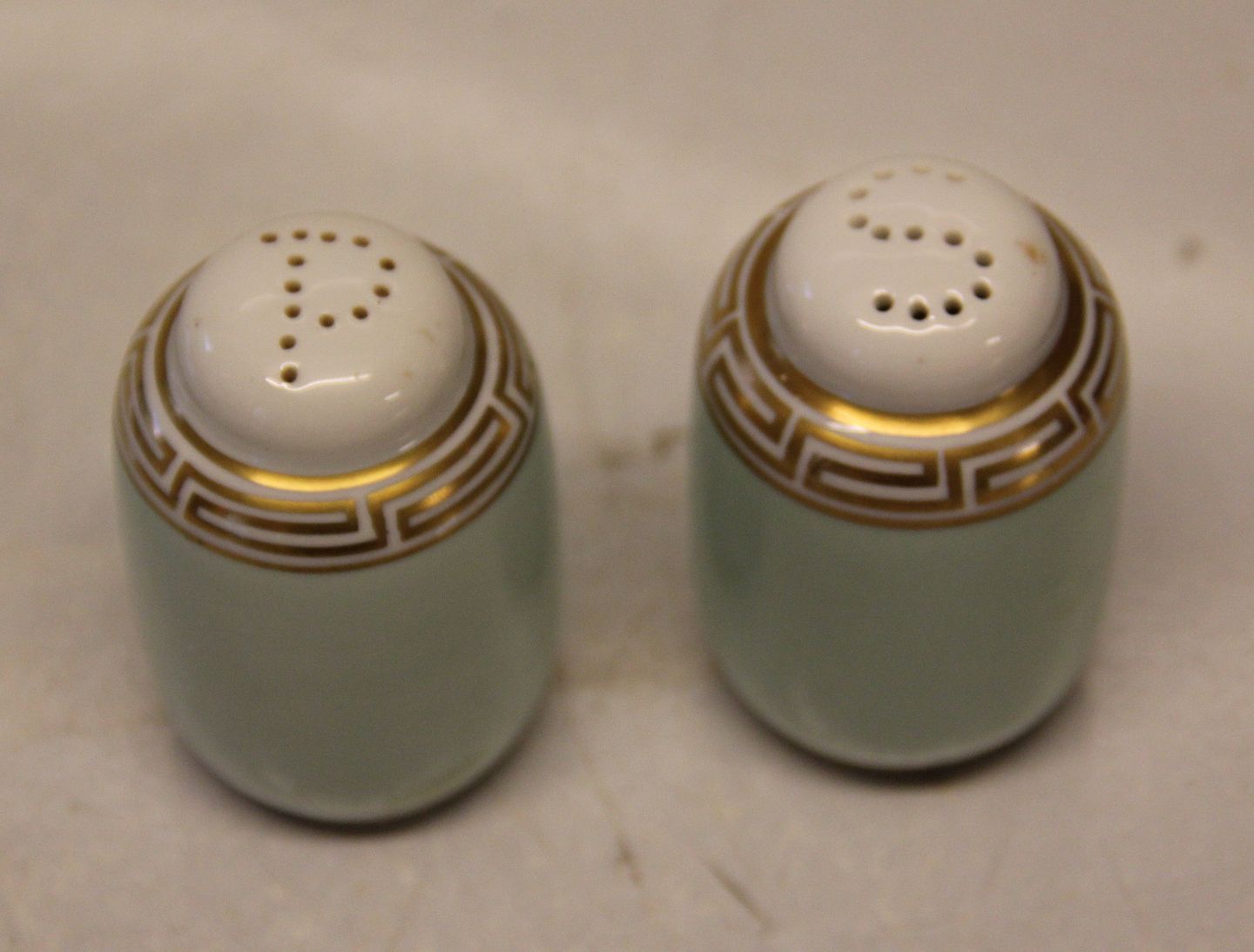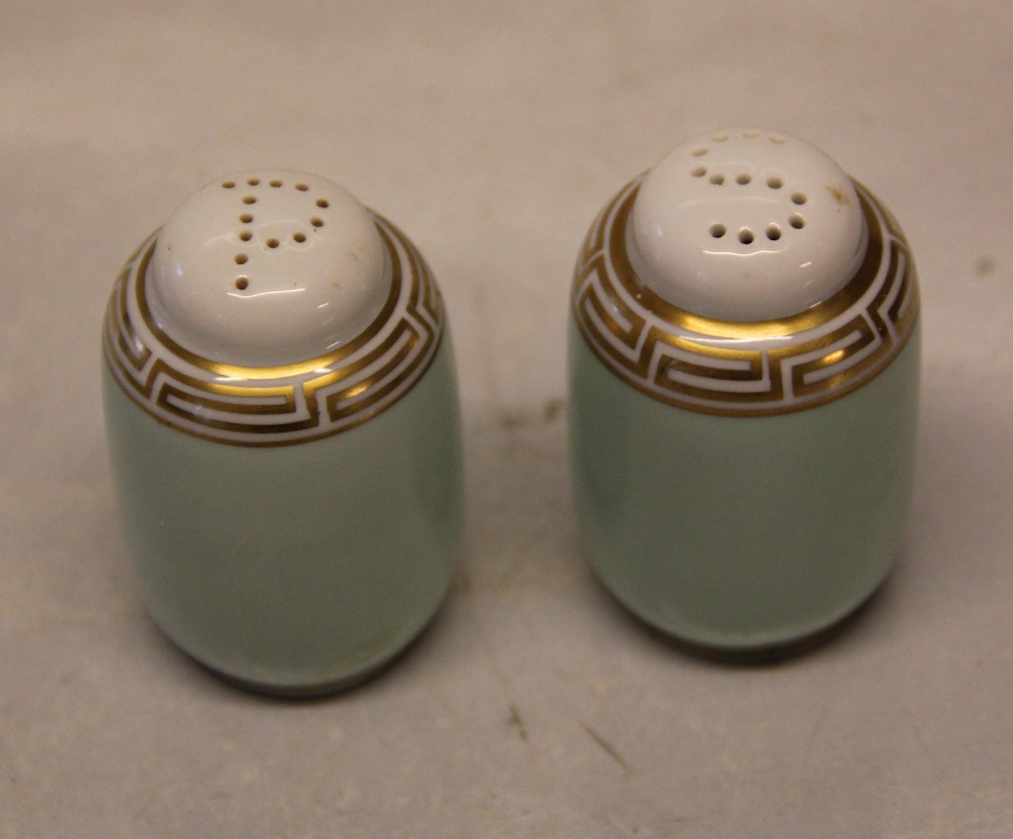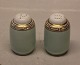 Marstrand B&G porcelæn Hvidt porcelæn, antik græsk kantet guldbort på grøn kant 052 Salt og peber 6.5 cm