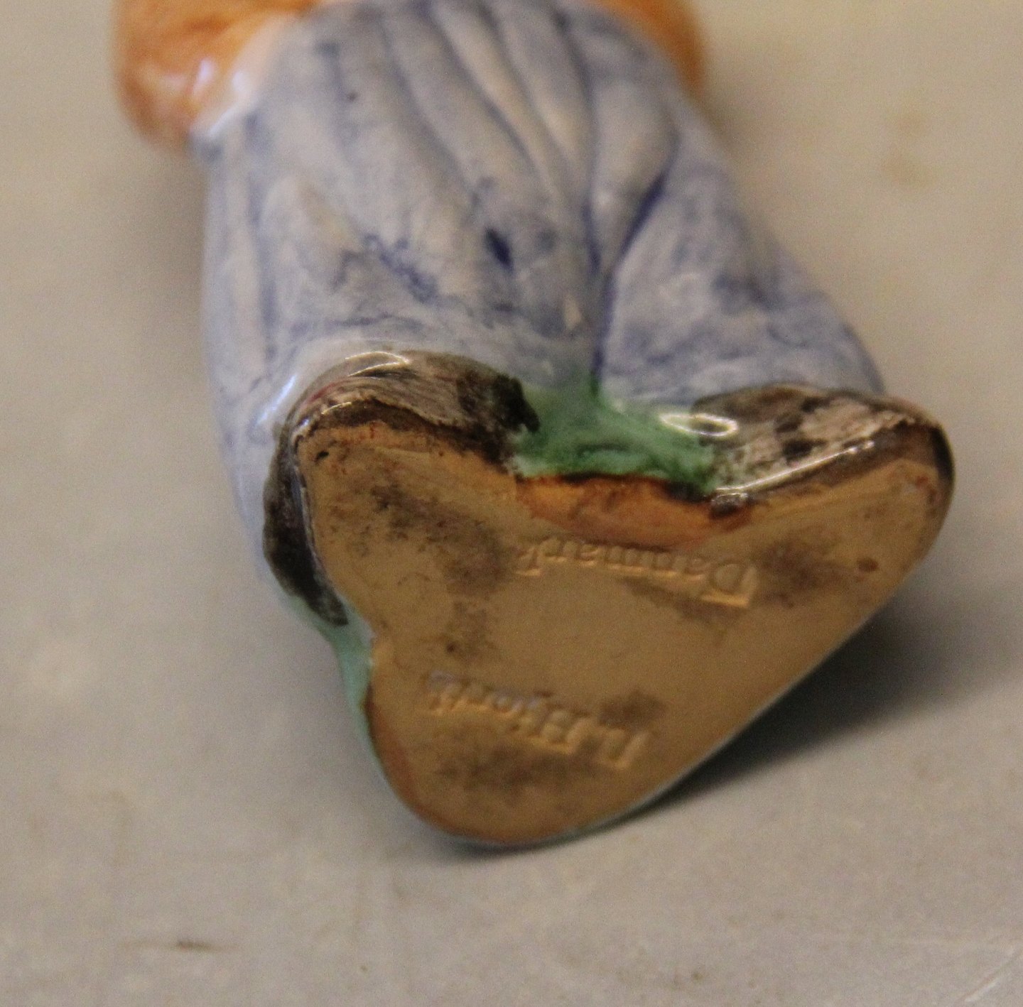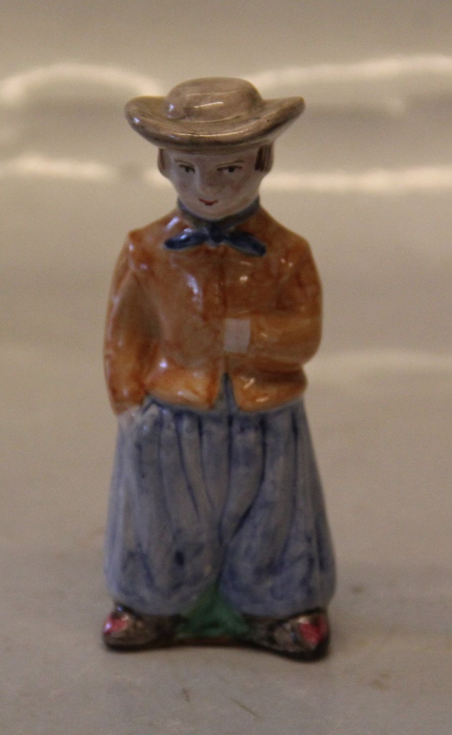 Beskrivelse: L. Hjorth Miniature i egnsdragter - Ungmand i orange og blåt 10 cm Bornholmsk Keramik