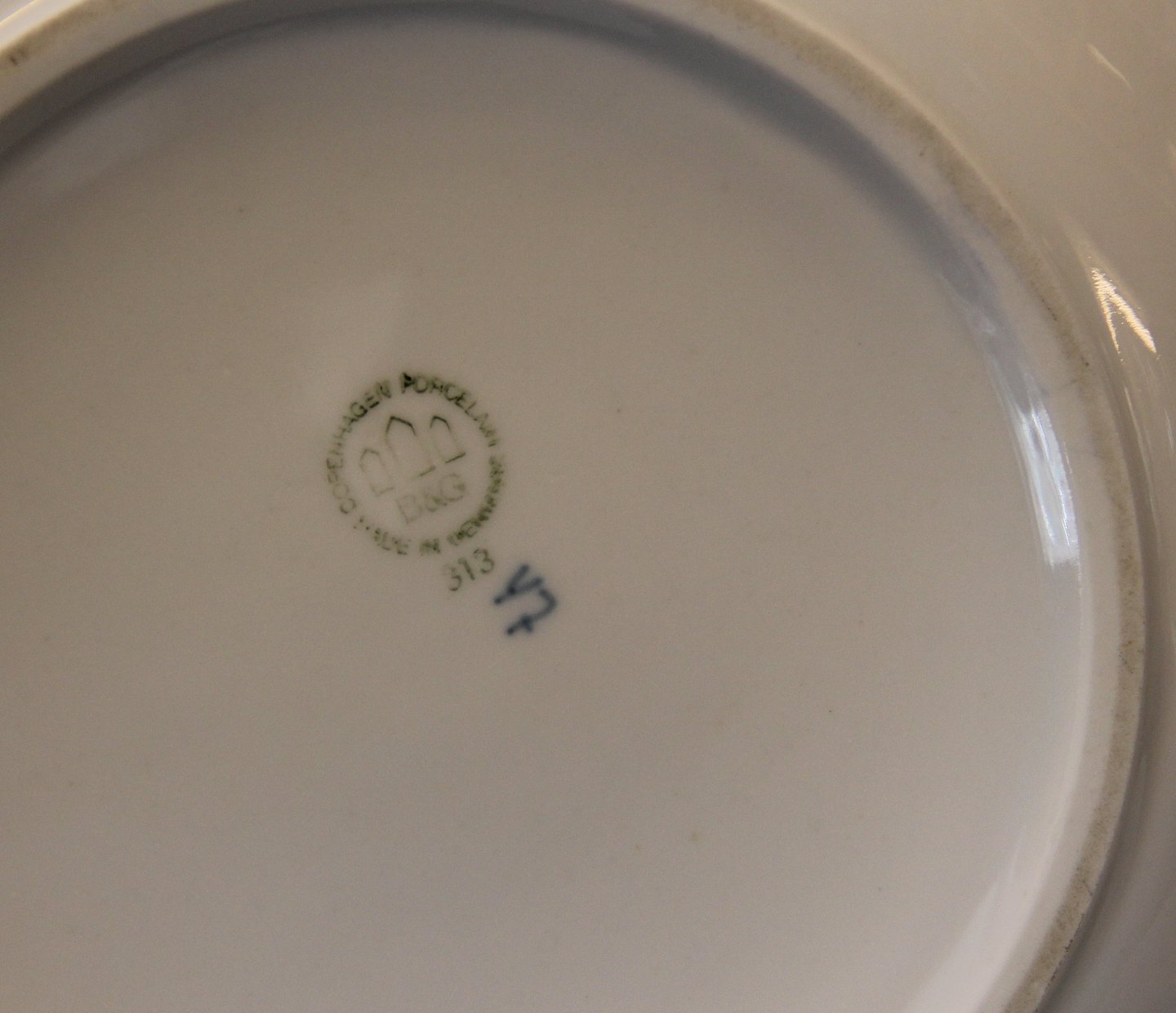 313 Salatskål 10,5 x 23,5 cm B&G Delfi: Kraftigt hvidt porcelæn med mønster med blå streger, som Olympia, form 43 Bing & Grøndahl Delphi