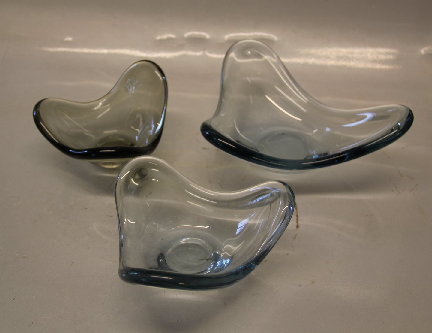 Beskrivelse: Holmegaard Fionia 1955 Røgfarvet trefløjet skål 8.5 x ca 13 cm 386 gram Pet Lutken PL Kunstglas