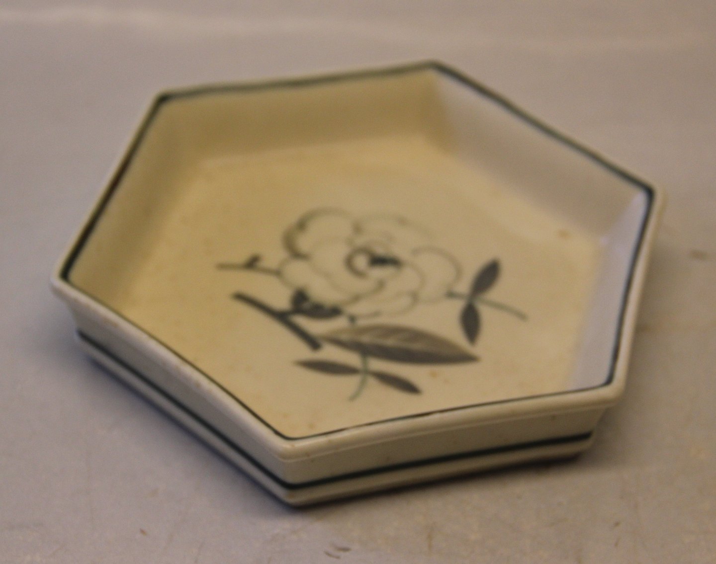 054-24 Kgl. Sekskantet fad 15 cm Druer og vin og 021-24 Hvid Blomst Mat Aluminia Porcelain