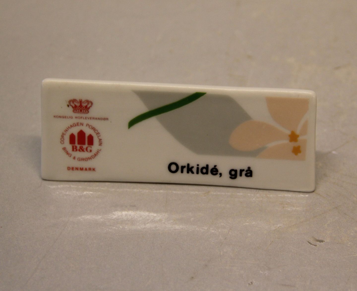 Beskrivelse: Bing & Grøndahl B&G forhandler skilte for Grå Orkide Ca 4 x 10 cm I fin og hel stand.
