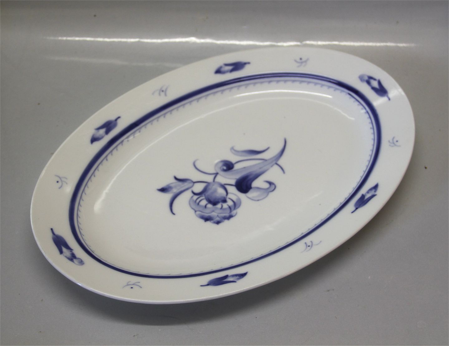 015 Stort ovalt stegefad 39,5 cm (315) Bing & Grøndahl Jubilæumsstellet: Blå nellike, hvid, underglasur, form 595 Design Hans Tegner og dekoration af Jo Hahn Locher B&G Fabrikkens 75 års Jubilæum i 1928