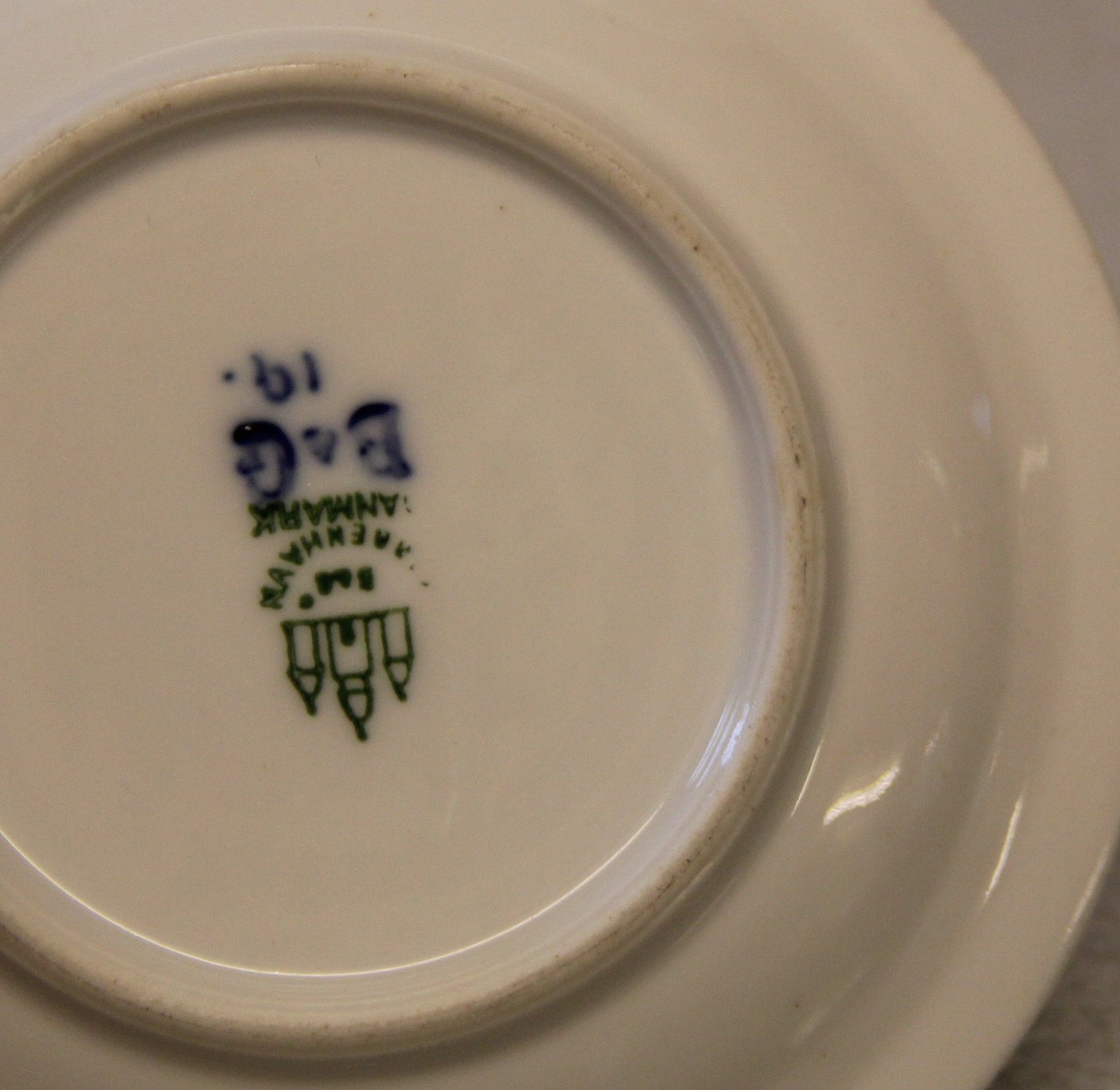 030 Smør kuvert, rund 11 cm (330) Bing & Grøndahl Jubilæumsstellet: Blå nellike, hvid, underglasur, form 595 Design Hans Tegner og dekoration af Jo Hahn Locher B&G Fabrikkens 75 års Jubilæum i 1928