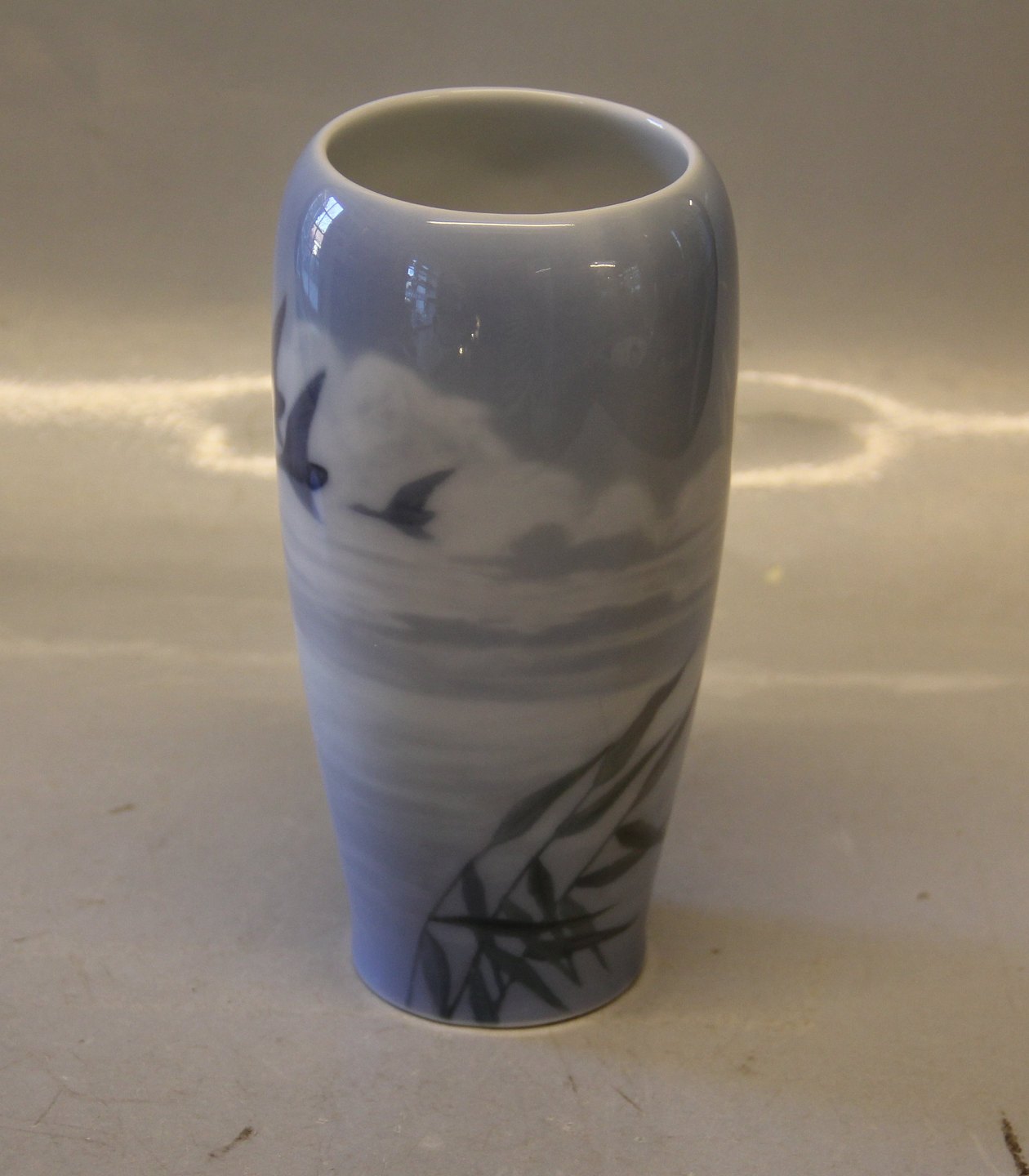 Beskrivelse: 235-1440 Kgl. Vase 16.5 cm med andefugle over en sø - ænder i flugt fra Royal Copenhagen I hel og fin stand