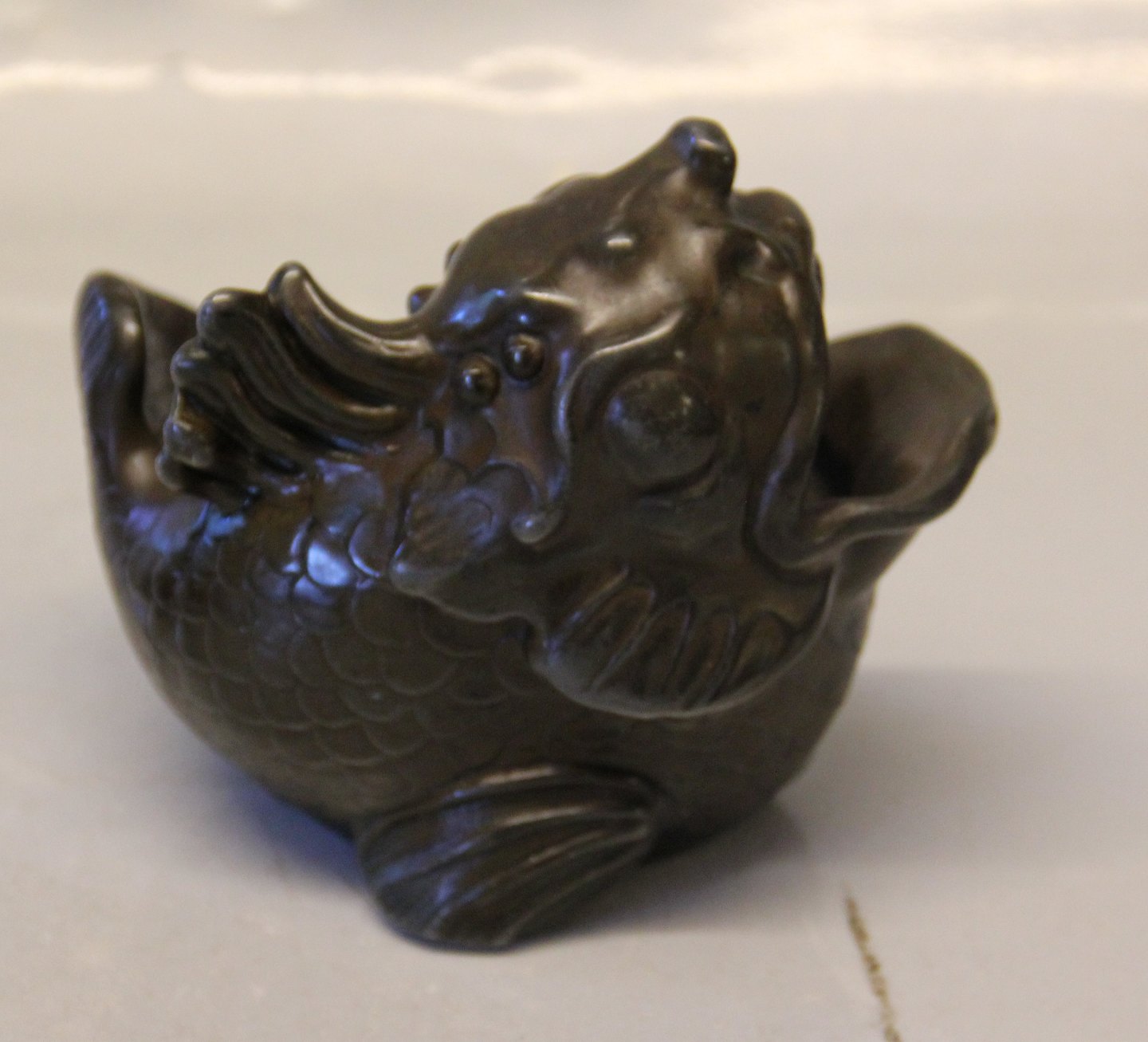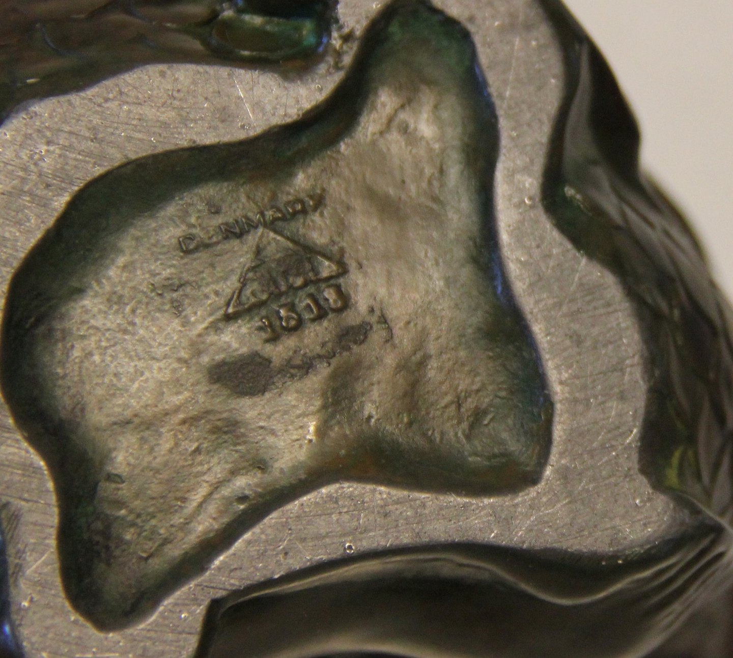 : Just Andersen Fisk 1518 Disko figur 12 x 13 cm Patineret fiskevase Stor og lille fisk Fin patinering