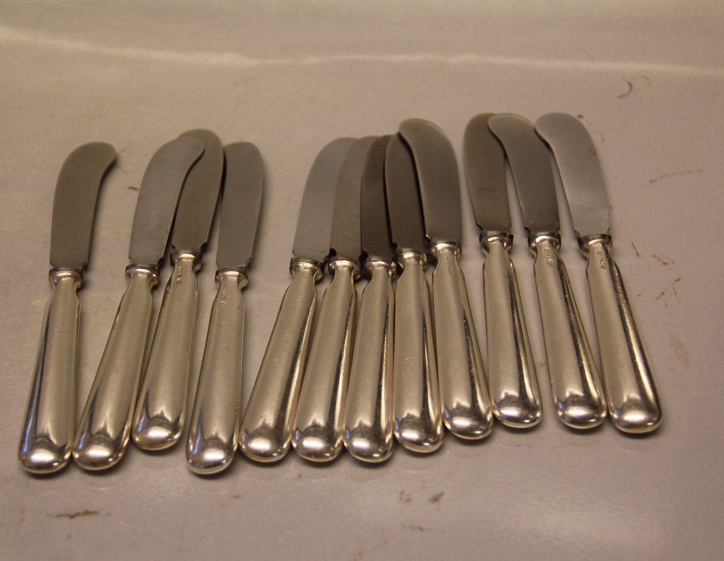 Ukendt ?12 stk Sølvplet Smørknive 17.3 cm Rustfrit Stålblad Raadvad DFA Kender nogen navnet ?