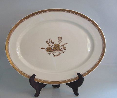 9584-947 Fad, ovalt 26 x 34 cm Kongelig Dansk Liselund #947 Gl. Kløverblomst i guld på cremefarvet stel med graveret bred guldkant. Design Thorkil Olsen. (Golden Clover) I fin og hel stand.