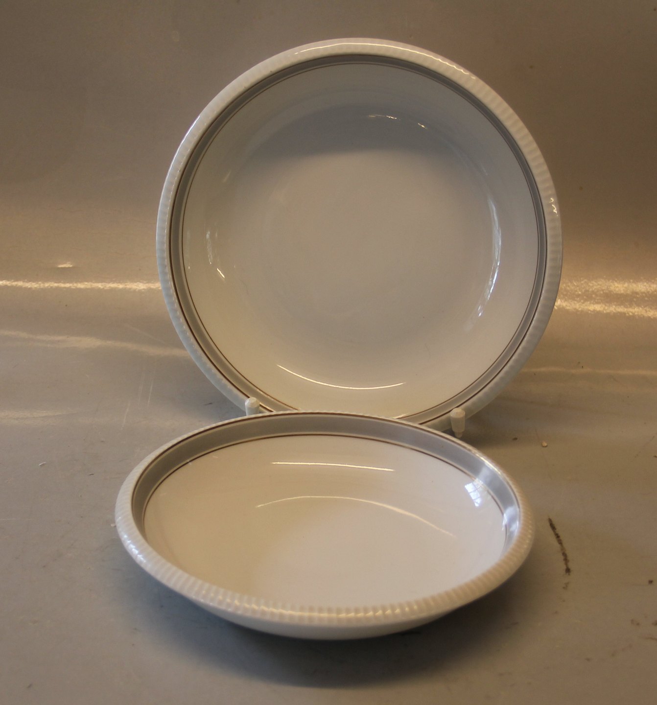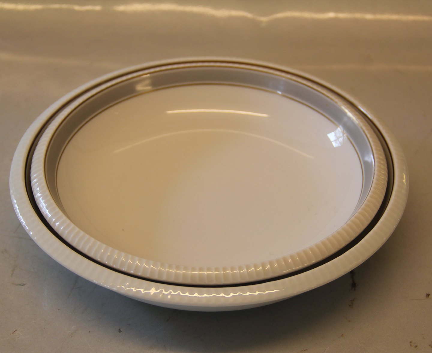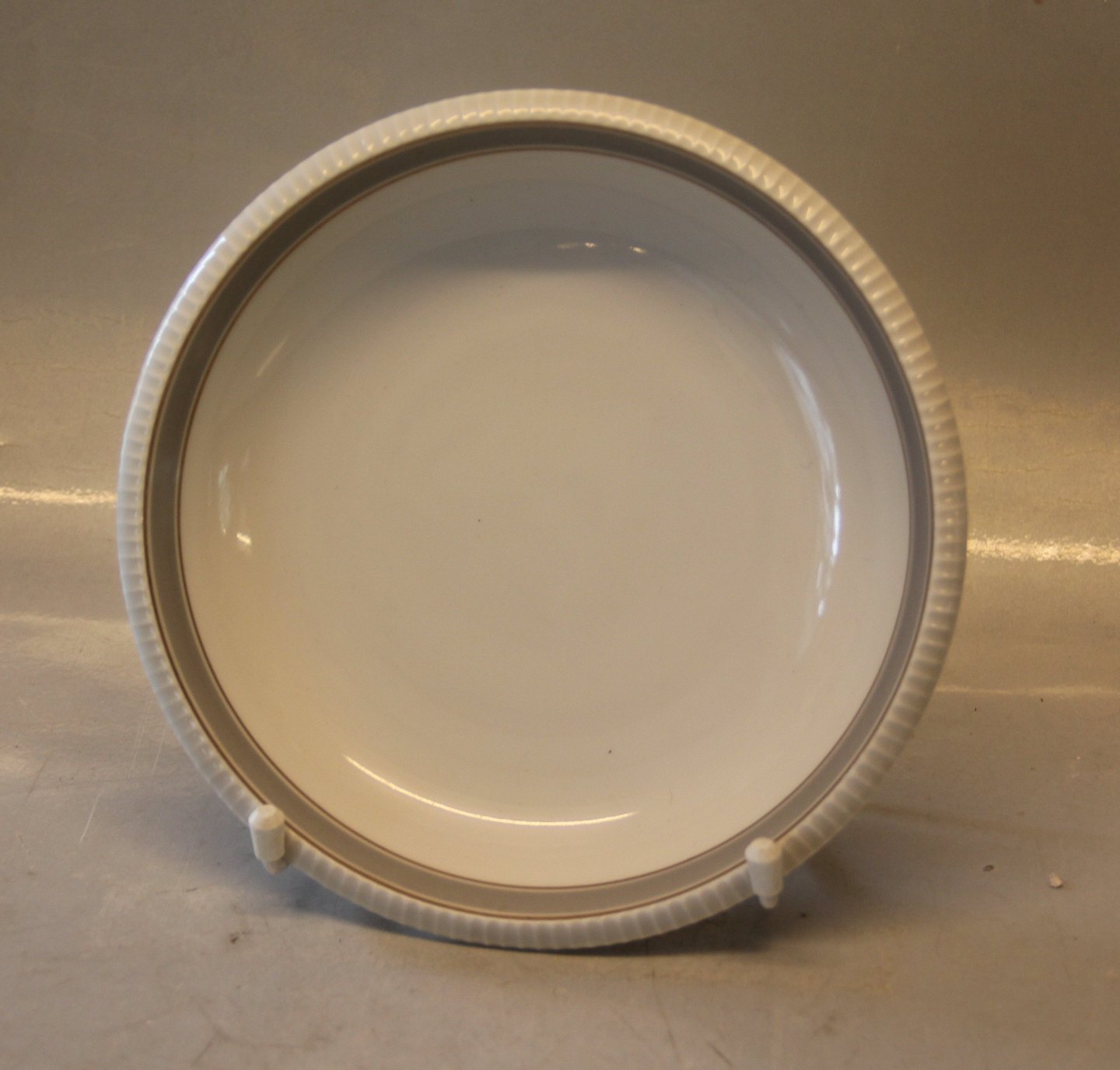 023 Dyb tallerken 19 cm (323) Norma, Riflet kant guld og bred grå kant, form 674 formgivet af Sigward Bernadotte.