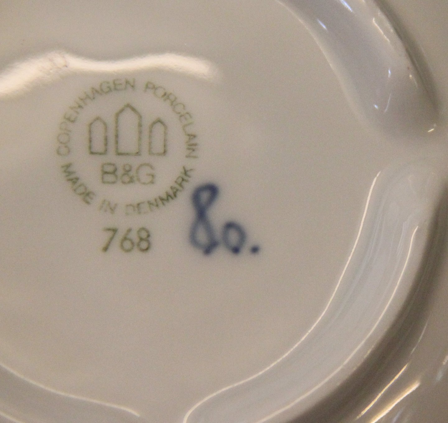 1029 Suppekop 5.5 x 12 cm + to hanke og underkop 17.8 cm (768) Bouillonkop Bing & Grøndahl Jernporcelæn Blåmalet - musselmalet - musling - Kraftigt hotelporcelæn I fin og hel stand.